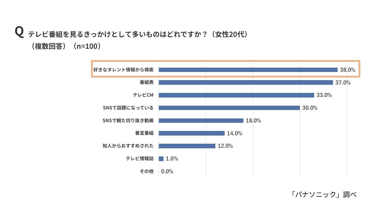 続いてテレビ番組を見るきっかけについて聞いたところ、「番組表」を回答した人が全体で41.6%、テレビCMからが33.4%となりました。しかし、10代、20代の女性はともに「好きなタレント情報から検索」が最多となり、テレビ番組の視聴にも「推し活」が影響していることが考えられます。