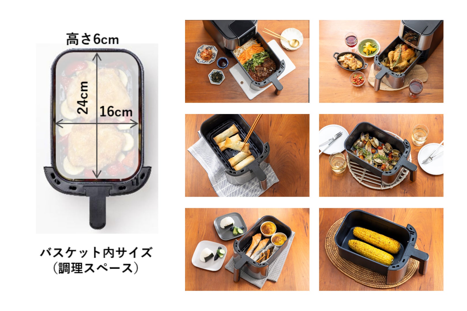 コンパクトデザインなのに、4Lのしっかり大容積。広い庫内は食材を均等に並べやすく、一度に複数の品目の調理や、魚の開きを一度に焼けるなど、効率的な調理が可能です。