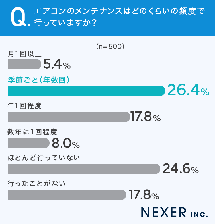 エアコンのメンテナンス頻度は「季節ごと(年数回)」の方が最も多く、26.4%の回答が得られました。