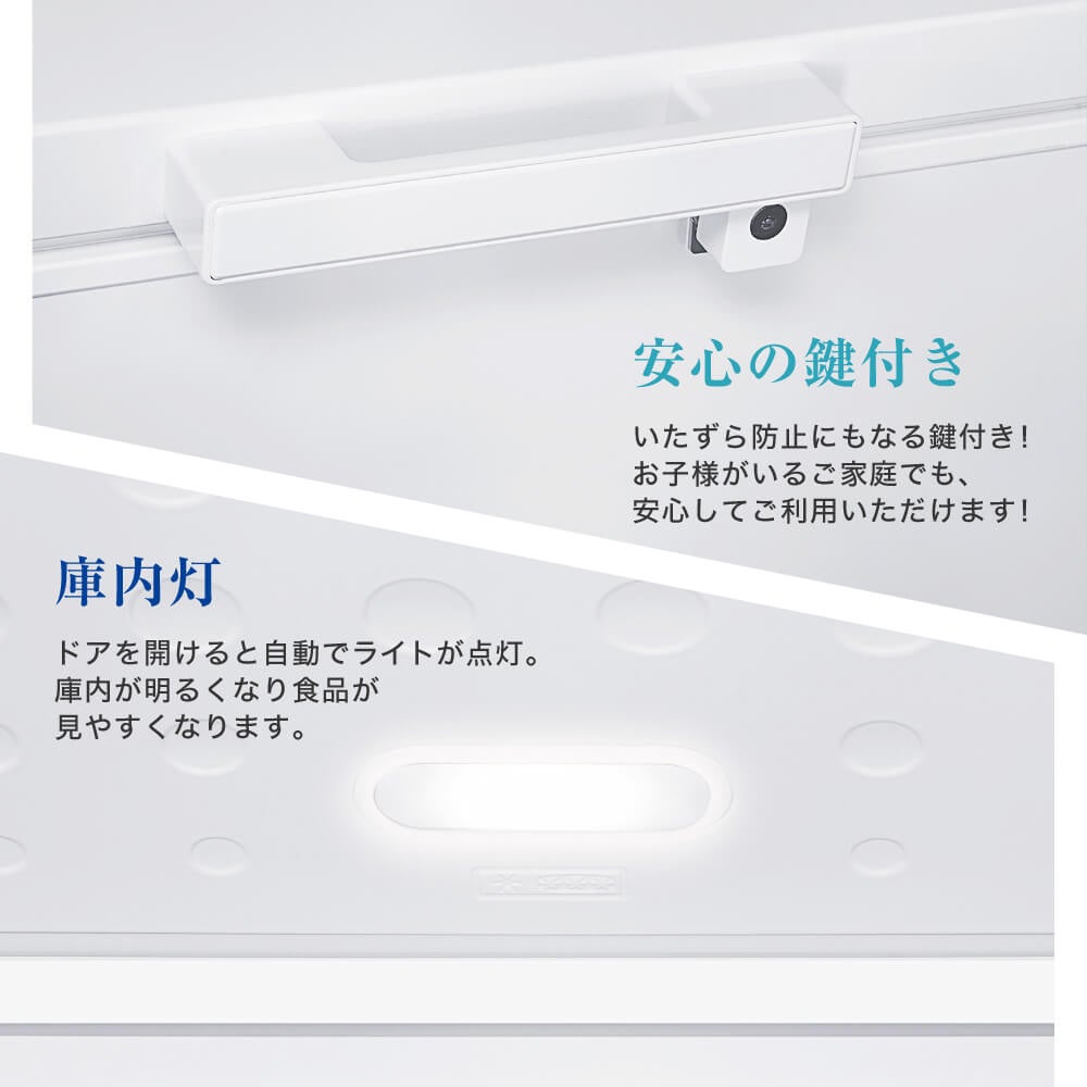 冷気は温かい空気よりも密度が高い為、下へ逃げる特性があります。その為、上開き式の扉を採用している本製品は、扉を開けても庫内の温度が上がりにくく、保存している食品を効率よく冷やすことができます。また、扉はお子様がいるご家庭でも安心してご利用いただける鍵付きで、扉を開けると自動で点灯する庫内灯も備えており、使いやすさに配慮した仕様としております。