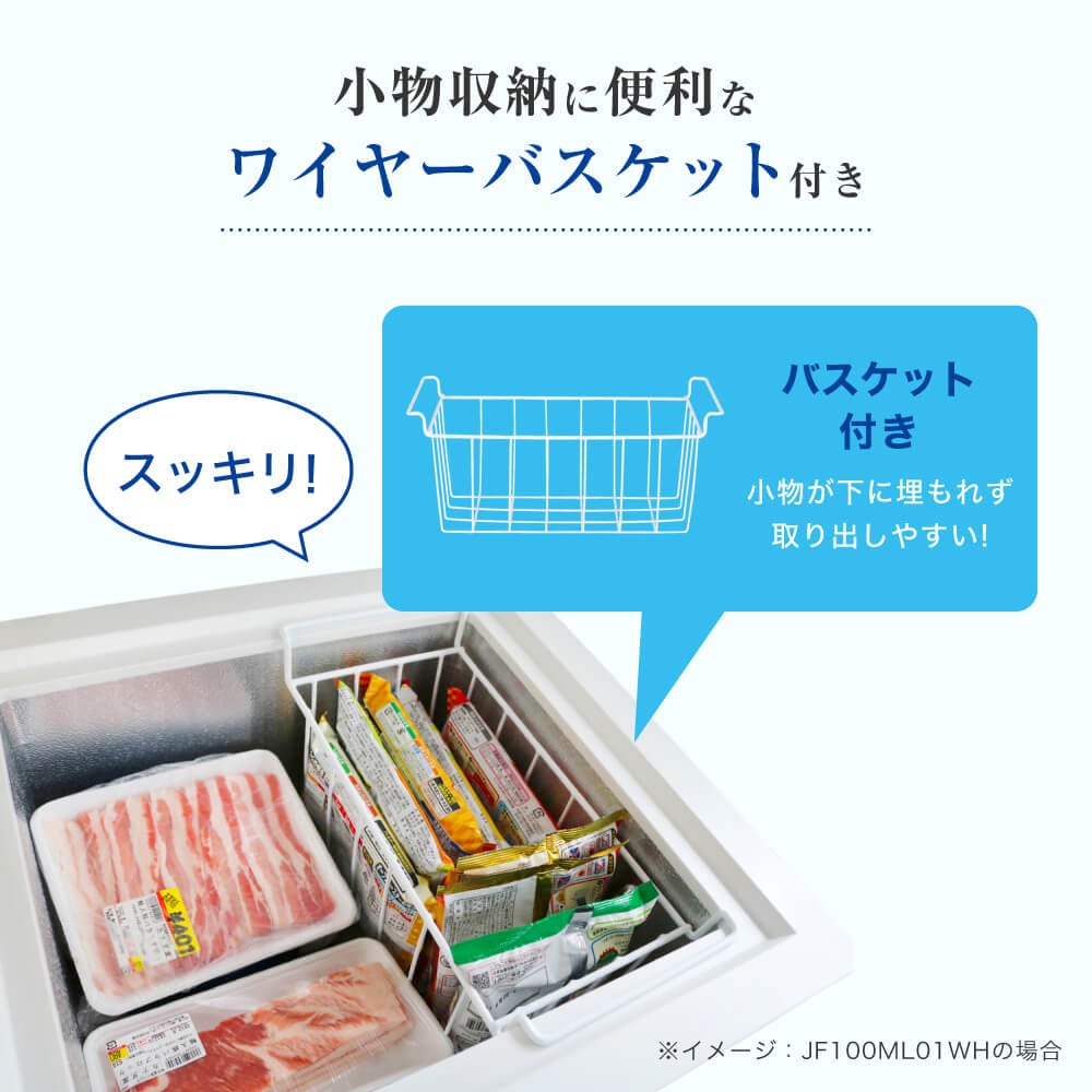 371Lと大容量なので、多様な食品を保存することができます。特売日に買い溜めした食材、ふるさと納税の返礼品、大量に作り置きした料理、釣り用の氷やえさ、釣れた魚など、普段使いの冷凍庫とは別の専用冷凍庫として、2台目にぴったりな製品です。また、付属のワイヤーバスケットにより、個包装の冷凍食品などの小物も底に埋もれずに簡単に取り出せるため、食品を整理整頓してスッキリと保存することができるので、食材をたっぷり保存することができます。
