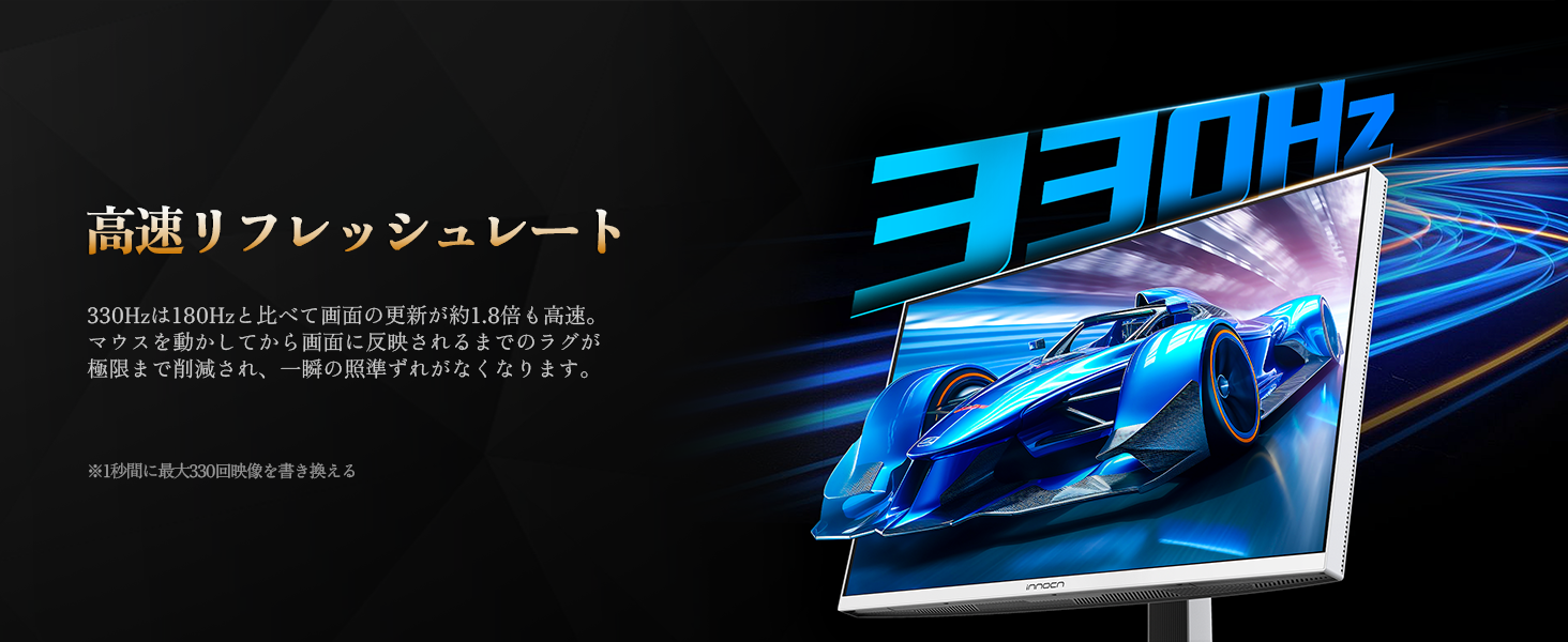本製品は、最大330Hzの超高リフレッシュレートに対応し、動きの激しいFPSやRTSゲームでもブレを極限まで抑制。