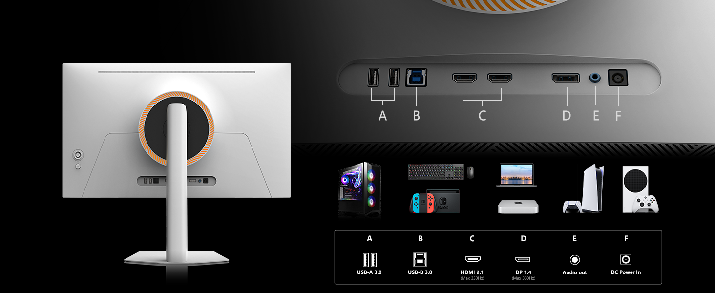 スタイリッシュなホワイトボディとフレームレスデザインを採用。メタルスタンドとRGBライティングを備え、ゲーム空間をよりクールに演出します。さらにHDMI 2.1·DP 1.4ポート·USBハブを搭載し、デスクトップPC、ノートPC、PlayStation®、Xbox®など、幅広いデバイスに対応します。