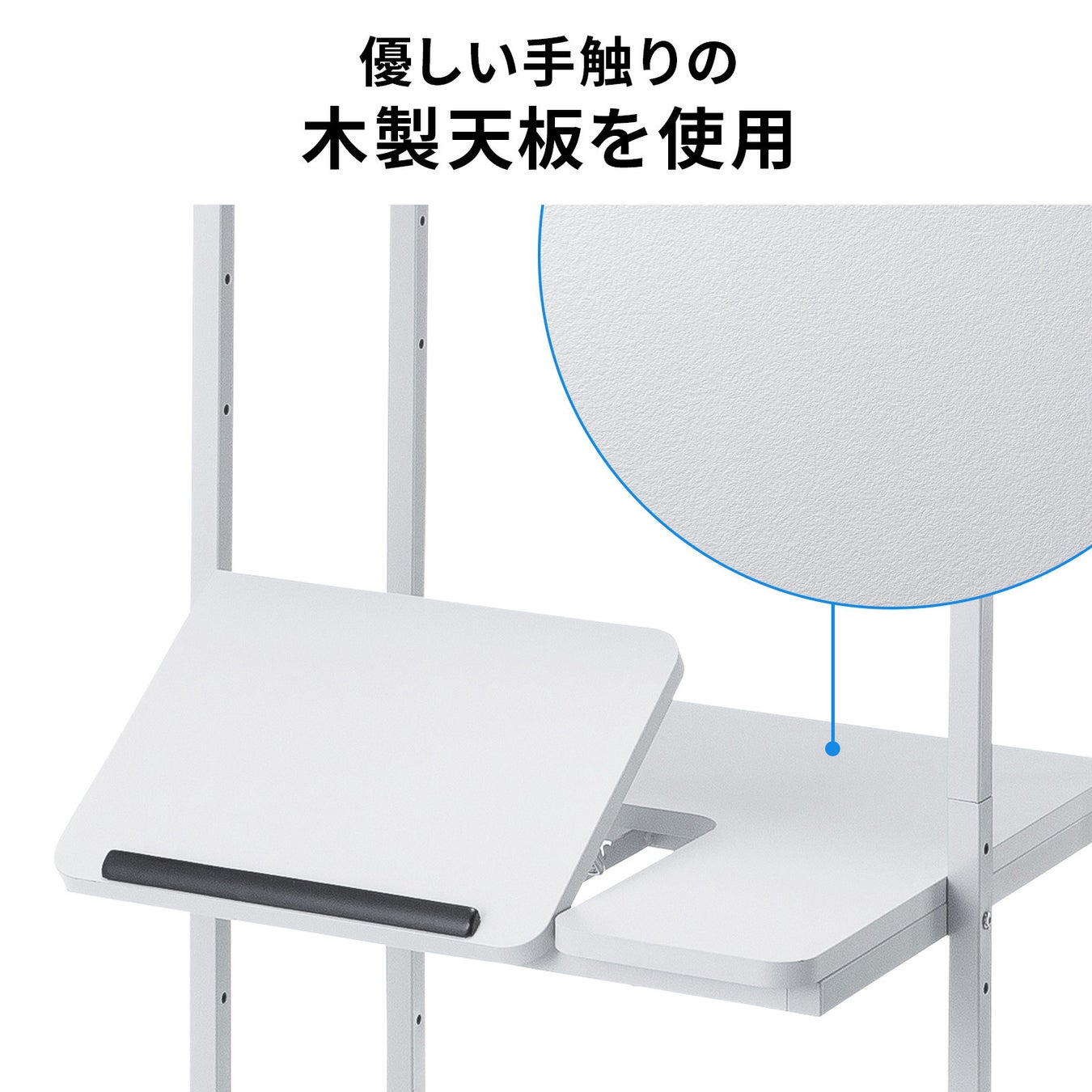 天板は角度調整が可能で、ノートパソコン操作や読書、資料作成、タブレット操作など、用途に応じて最適な角度と姿勢を維持できます。環境に優しい再生材の木製天板、ケーブルをすっきりまとめるバックパネル、一体感のあるスチール製下棚など、多彩な機能で作業環境を快適に整えます。