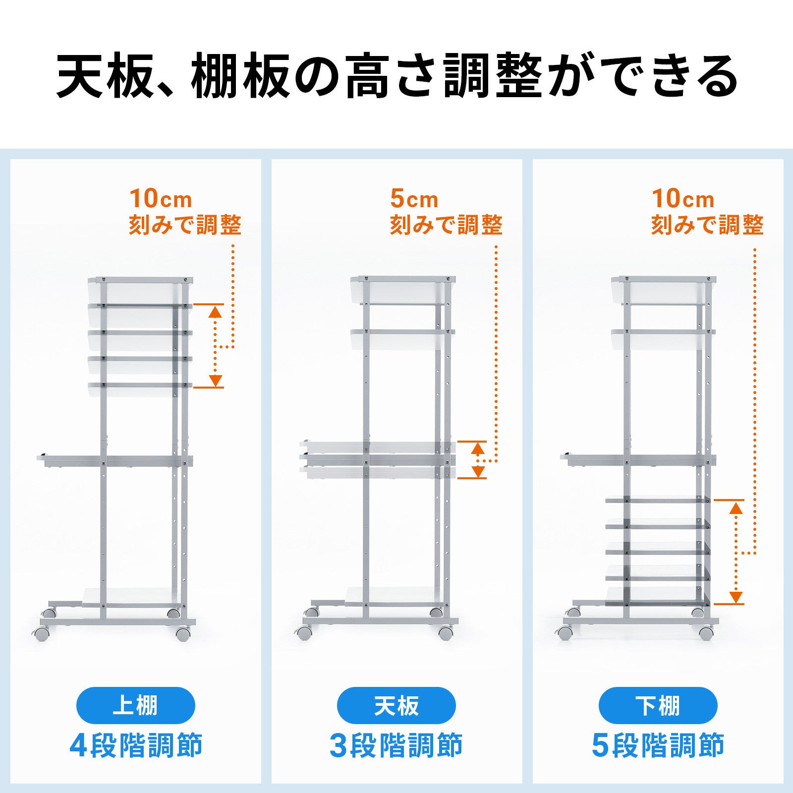 上棚、天板、棚板はそれぞれ高さ調整ができます。 用途や体格に合わせてお好みの位置でお使いいただけます。