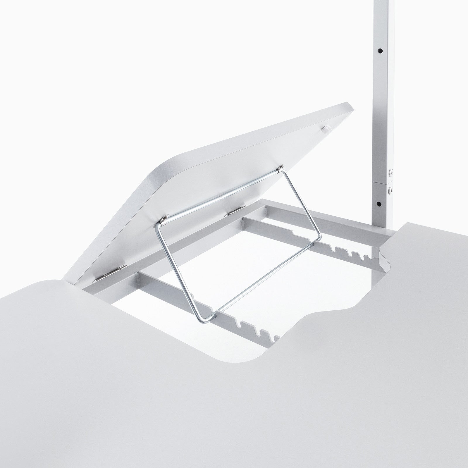 天板は角度調整が可能で、ノートパソコン操作や読書、資料作成、タブレット操作など、用途に応じて最適な角度と姿勢を維持できます。環境に優しい再生材の木製天板、ケーブルをすっきりまとめるバックパネル、一体感のあるスチール製下棚など、多彩な機能で作業環境を快適に整えます。