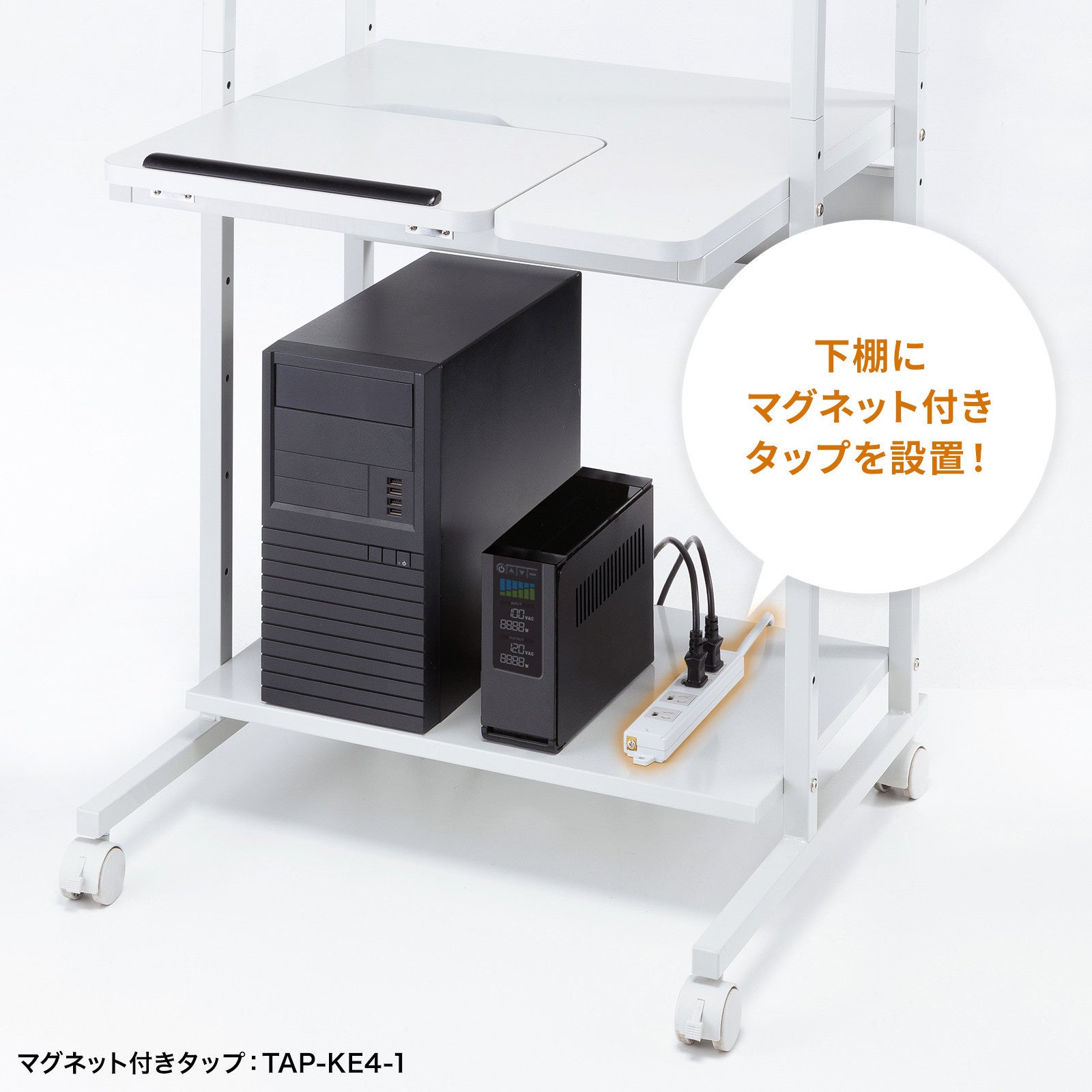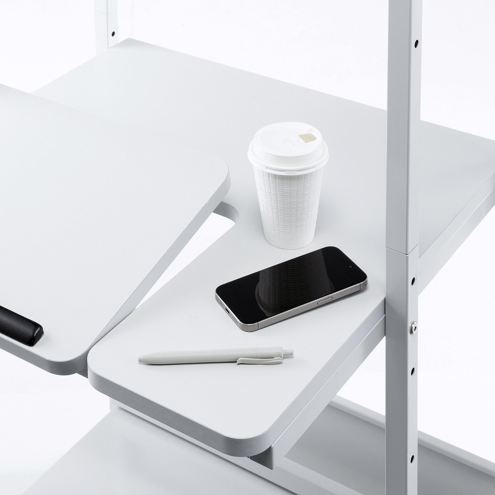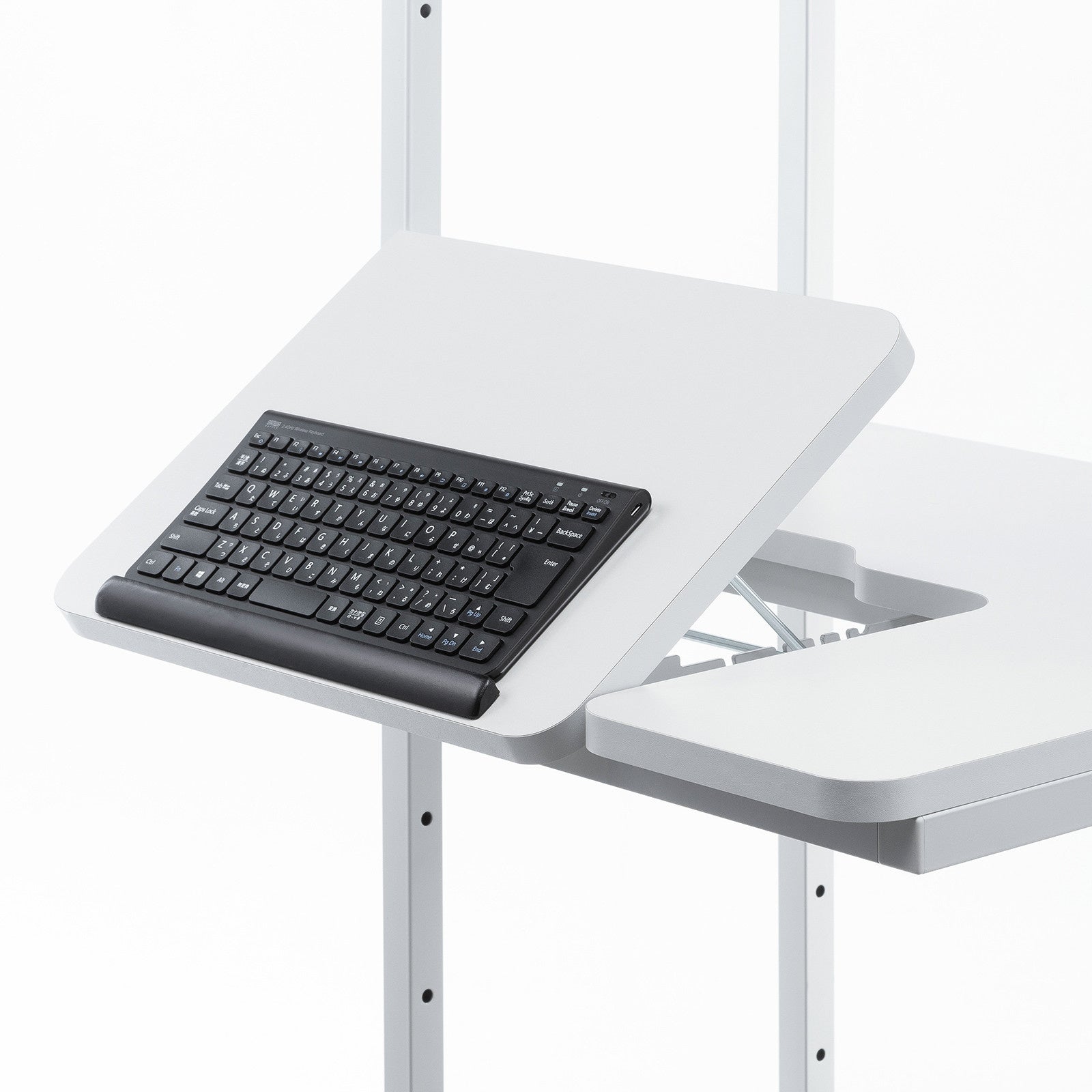 省スペース設計ながら高い収納力を実現した縦型ラックで、チルト天板部分で快適にタブレットやキーボードを操作しながら、水平天板部分にモニターやマウスなどを置くことができます。