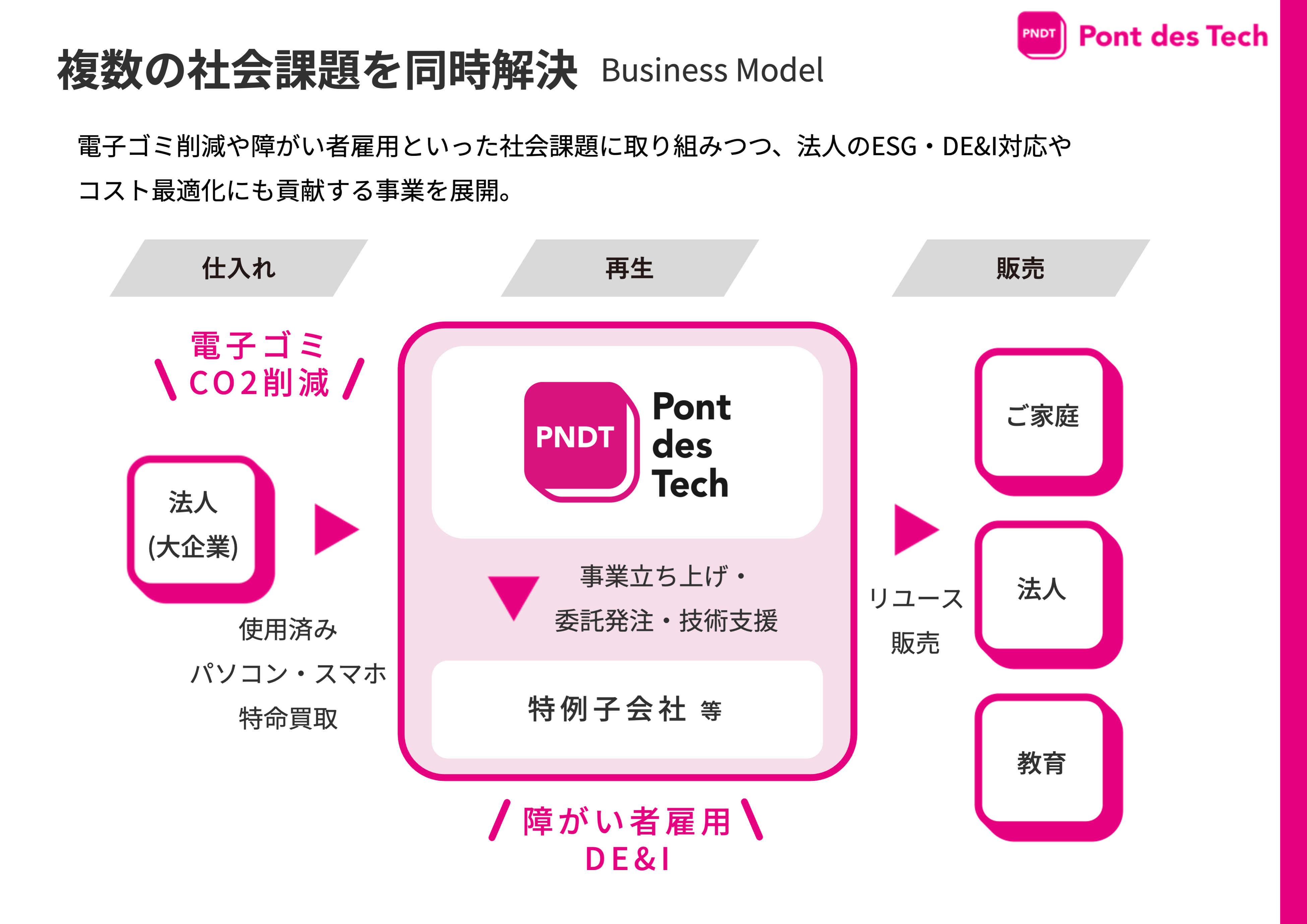 株式会社ポンデテックは、障がい者雇用の拡大と電子廃棄物の削減という、ふたつの社会課題の同時解決に挑む関西電力100%出資のベンチャー企業です。
