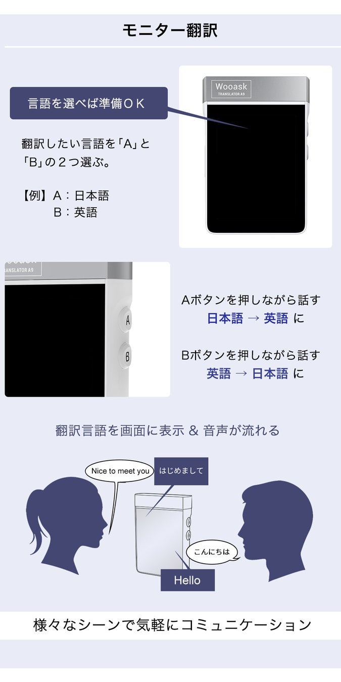 翻訳イヤホン、大型ディスプレイ、翻訳カメラが内蔵。3つの翻訳をリアルタイム高速翻訳で体験。