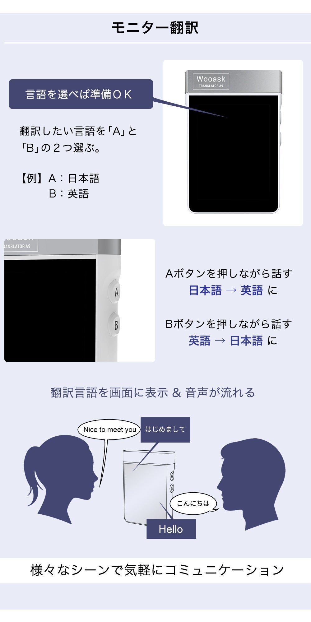 さらにシリーズ初のSIMカード通信対応の通話ができるAI翻訳機 「 Wooask A9 」を完成させました。