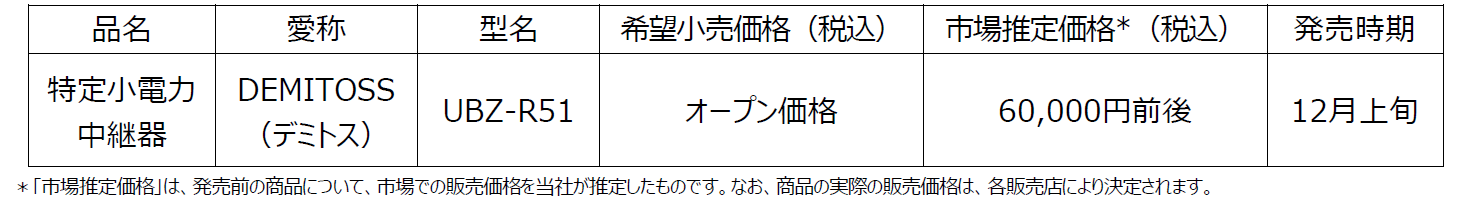 当社は本機を、免許も資格も申請も不要で、基本料や通話料もかからず、“だれでも・どこでも・簡単に・快適な”コミュニケーションを提供する“DEMITOSS”シリーズの特定小電力中継器として市場展開します。