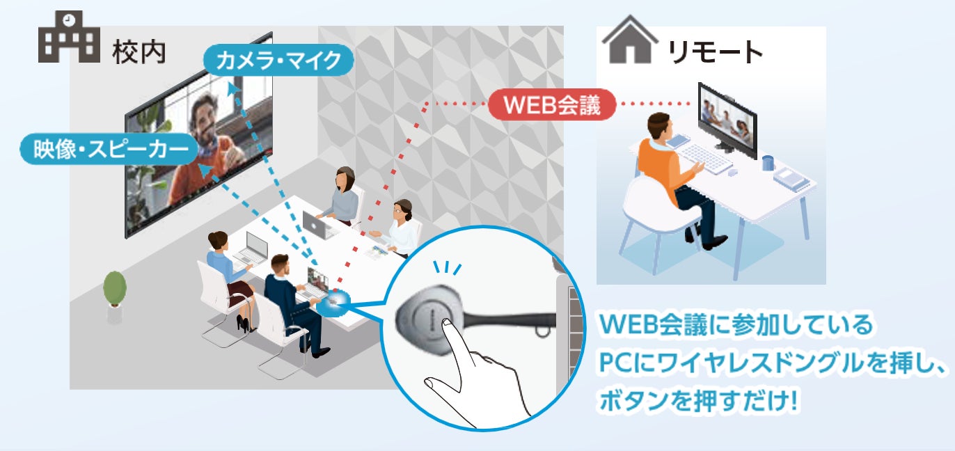 カメラ・マイク・スピーカー内蔵のオールインワン設計。他の機器を準備する必要がなく、オンライン授業・交流会・保護者面談などがすぐに始められます。BYOD(Bring Your Own Device)対応で、普段使っているPCからそのままWEB会議が可能。校内ネットワークに接続していないPCでも使えます。