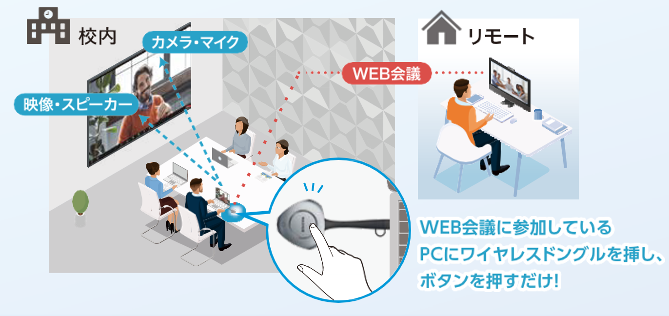 カメラ・マイク・スピーカー内蔵のオールインワン設計。他の機器を準備する必要がなく、オンライン授業・交流会・保護者面談などがすぐに始められます。BYOD(Bring Your Own Device)対応で、普段使っているPCからそのままWEB会議が可能。校内ネットワークに接続していないPCでも使えます。