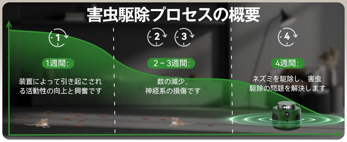 Thcritterの2025年最新アップグレード版ネズミ駆除器は、ネズミの聴覚と神経回路に直接刺激を与え、自然に近い形で駆除効果を発揮します。さらに、クモやゴキブリ、アリなどの害虫にも対応しており、1台で幅広い害虫対策が可能です。約3~4週間の使用で、効果を実感できます。