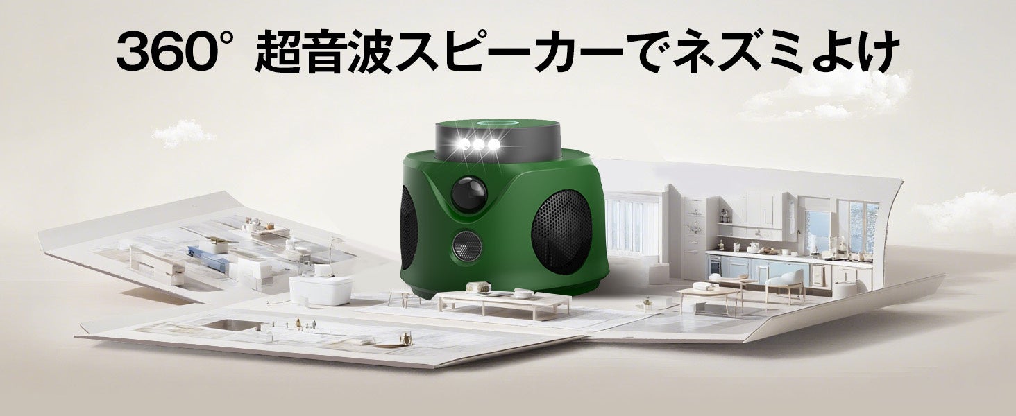 360°全方向に対応するスピーカーと400㎡の有効範囲により、広い空間でもしっかり駆除。化学薬品・殺鼠剤を使わず、静音設計で家庭環境に優しい仕様です。消費電力はわずか1.5Wで、コンセント差込式のため充電不要ですぐに使用できます。