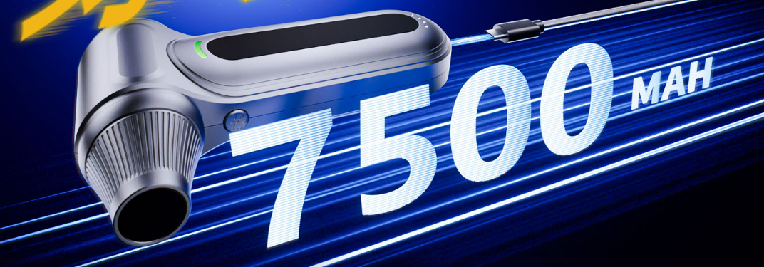 バッテリーは7500mAhの大容量で、最小風力条件下で最大200分の連続運転が可能。AIスマートチップによる過充電・過放電・過熱防止機能を搭載し、寿命を延ばす設計です。USB-C急速充電対応で、わずか2.5時間でフル充電できます。