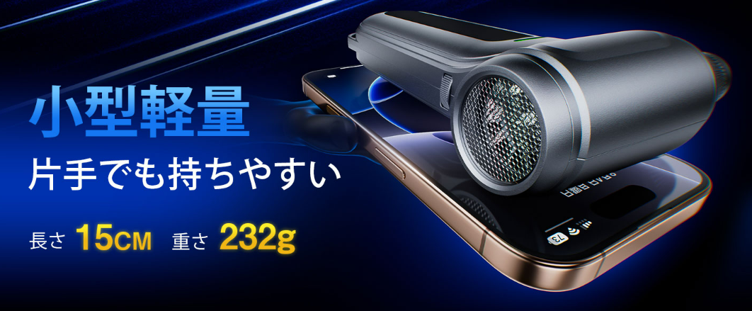 コンパクトな手のひらサイズ(150×65×25mm)で重量232g、持ち運びも容易。付属の収納袋で持ち運びや保管も便利です。また、缶タイプエアダスターに比べCO2排出量を90%削減し、充放電サイクルは2,000回以上対応。環境にも配慮した製品となっています。