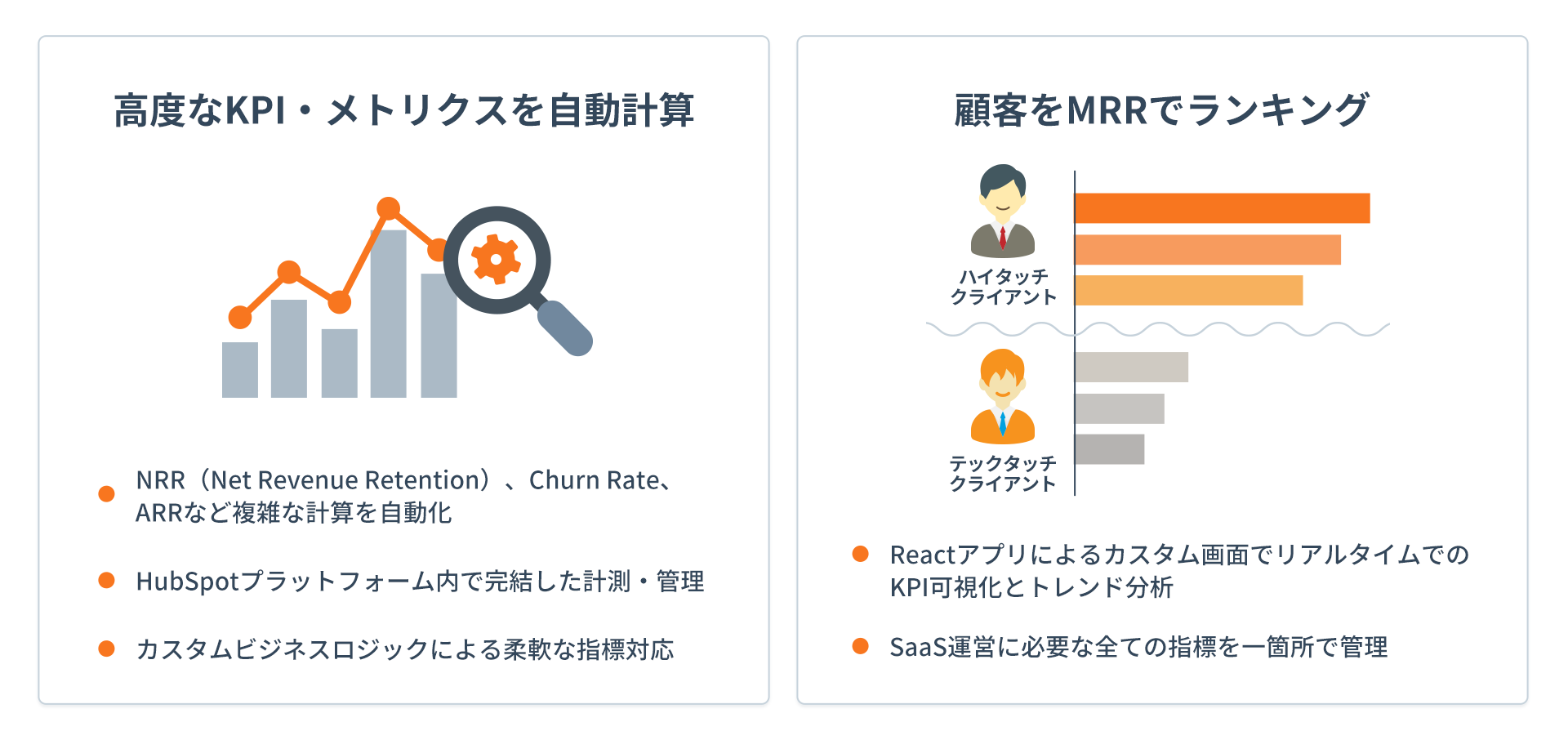 NRR(Net Revenue Retention)、Churn Rate、ARRなど複雑な計算を自動化し、HubSpotプラットフォーム内で完結した計測・管理を実現。カスタムビジネスロジックによる柔軟な指標対応も可能です。