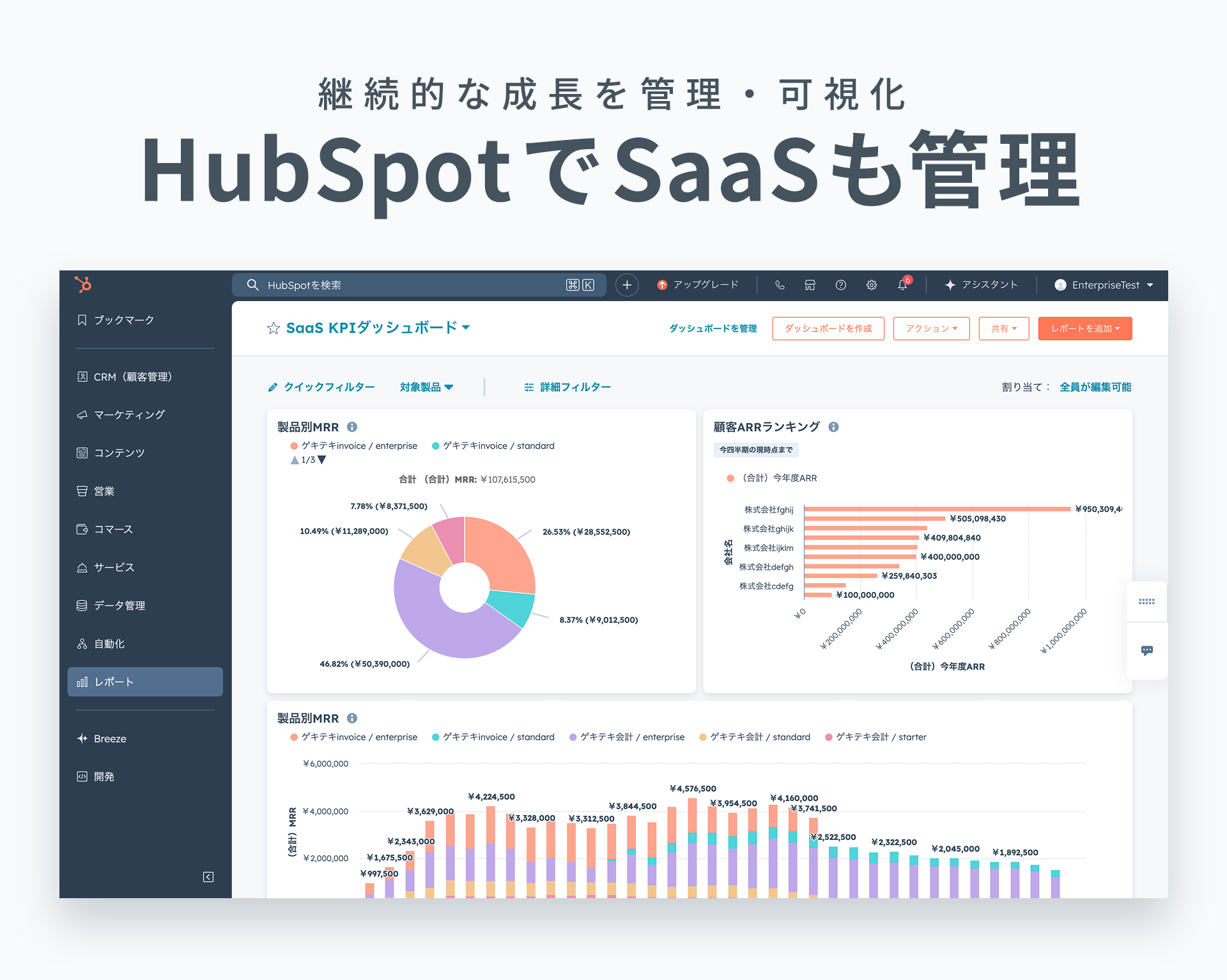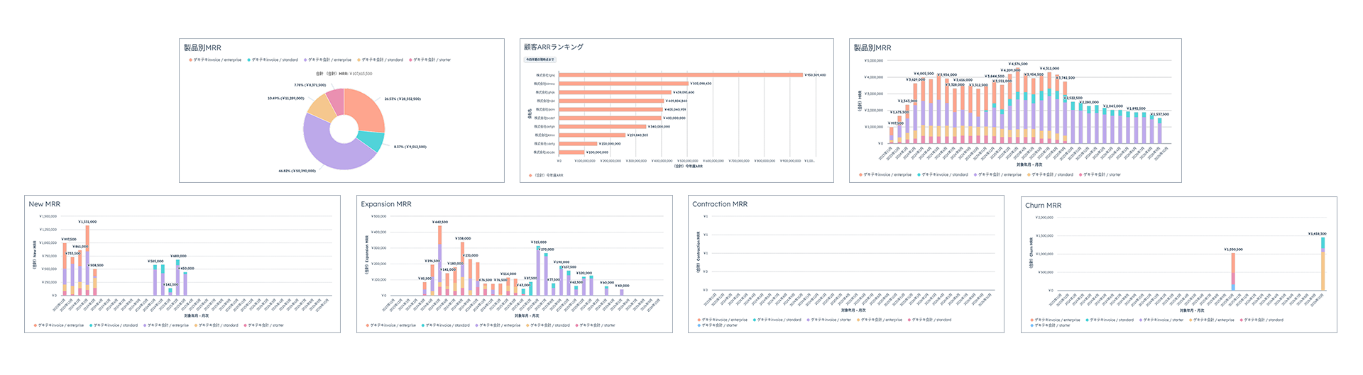 HubSpot内でサブスクリプション収益とKPIメトリクスを完結して管理できる統合プラットフォームを提供。製品別MRR、顧客別ARRランキング、月次MRR推移など、SaaS企業の成長管理に必要なダッシュボードを標準装備し、New・Expansion・Contraction・Churnなどの要素を自動分類して可視化します。