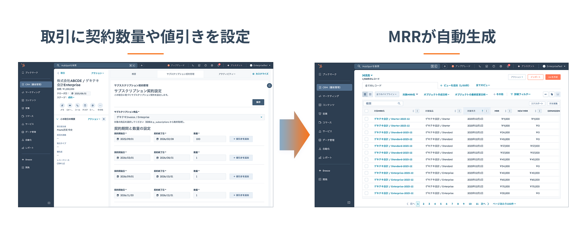 従来のDealモデルに加えて、月次継続収益やMRRをより詳細に管理できるようになり、New・Expansion・Contraction・Churnなどの専門的なメトリクスをHubSpot内で自動計測・可視化します。また、プランアップグレード、ダウングレード、追加ライセンスといった多様な収益変動の追跡や、SaaS運営に必要なデータのHubSpot内での一元管理を実現します。