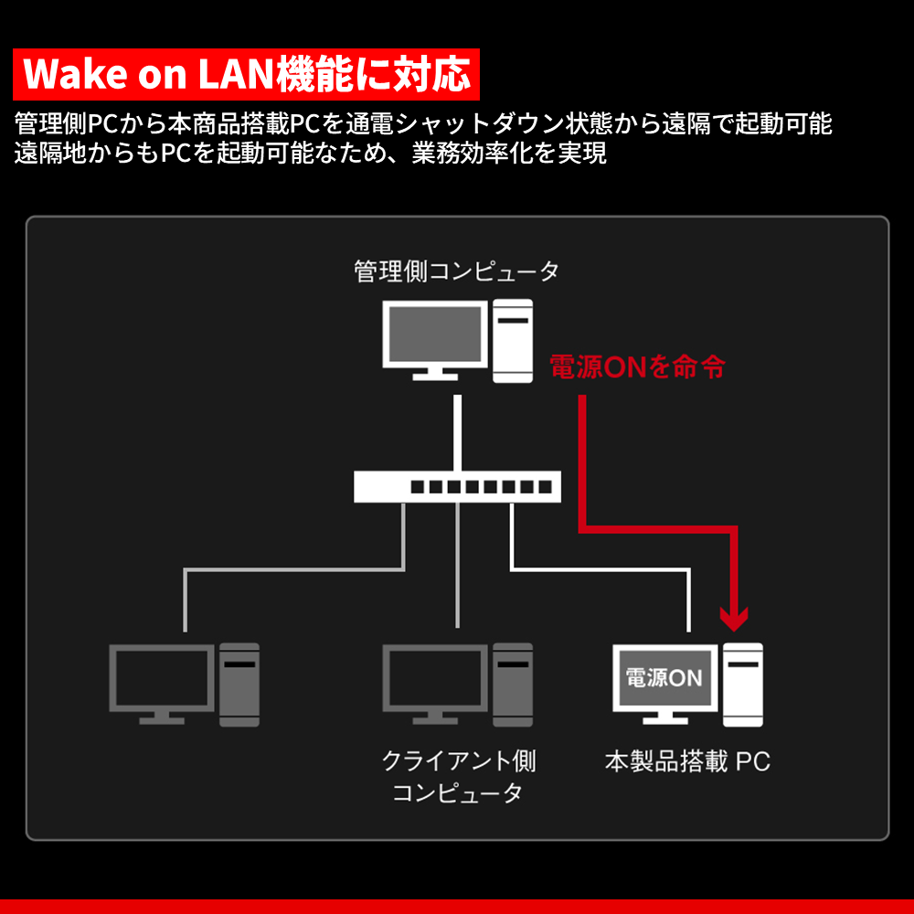 ハードウェアによるWake on LAN (WoL)機能に対応しているので、遠隔でパソコンを起動させることができます。