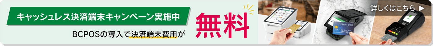 POSレジ購入時、POSレジアプリ「BCPOS」を導入いただくと、各種キャッシュレス決済端末が無料になるキャンペーンを実施中。詳細は下記サイトをご確認ください。