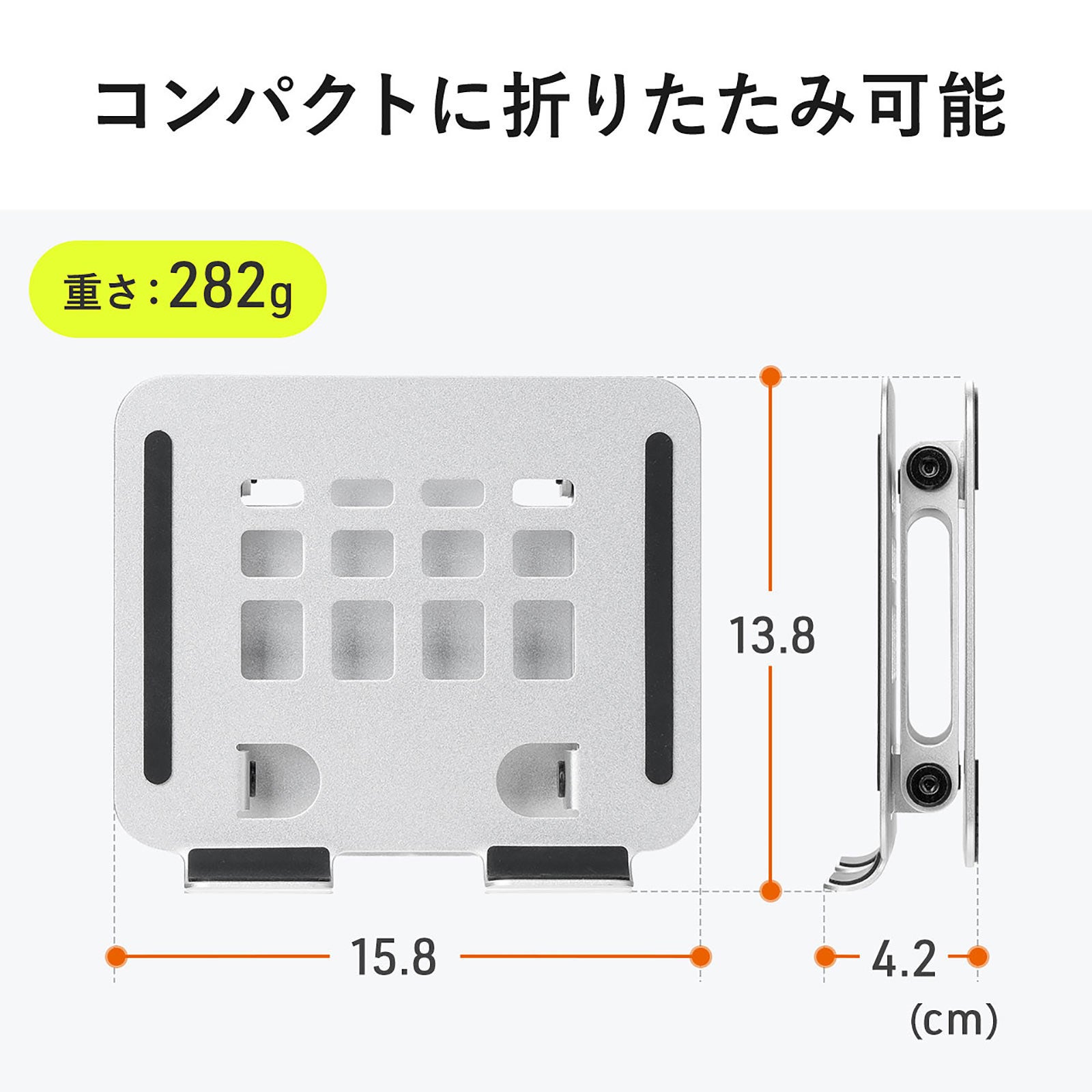 使わないときはサッと折りたため、厚さわずか数センチ。軽量アルミ素材だから、自宅はもちろんオフィスやカフェへの持ち運びもラクラクです。限られたデスクスペースでも場所を取らず、収納にも困りません。