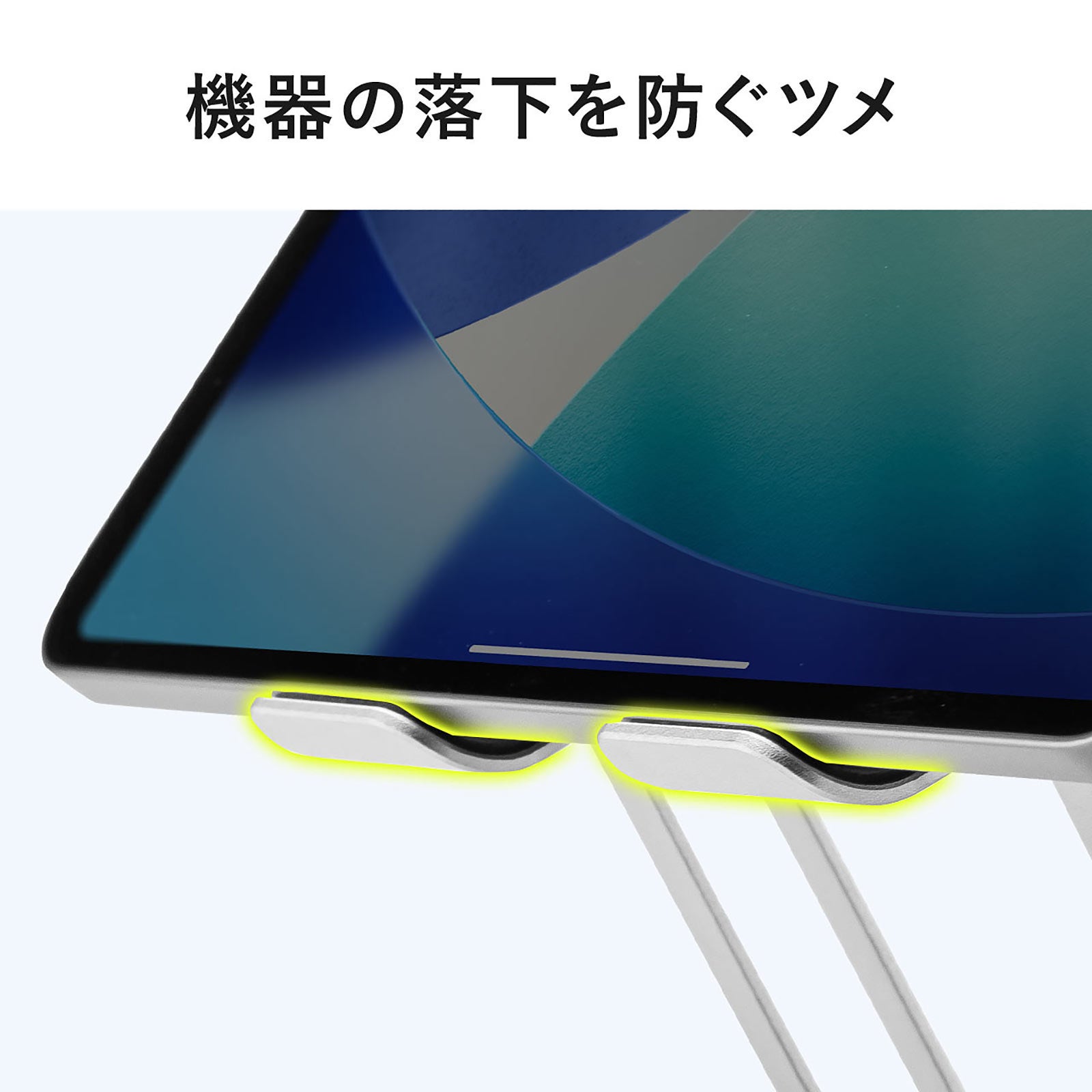 タブレットをケースに入れたままでもしっかり設置でき、底面には滑り止めラバーを採用。安定感抜群で、充電ケーブルを接続したままでも邪魔になりません。