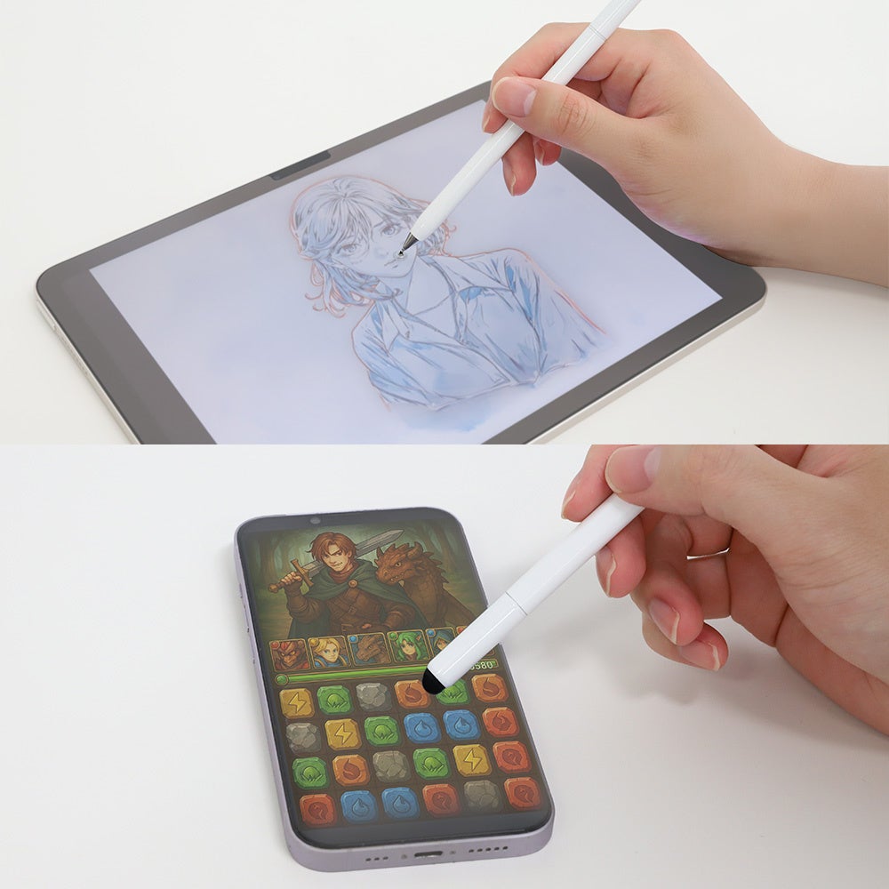 ペン先は導電繊維と透明ディスクの2WAY仕様。マグネットでキャップを吸着でき、充電不要でいつでもお好きなときにお使いいただけます。
