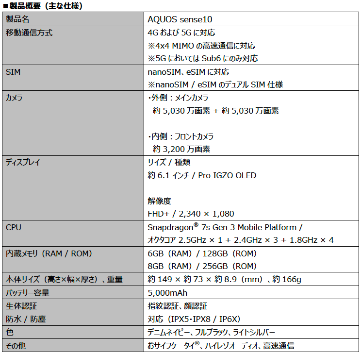 そのほか、5,000mAhの大容量バッテリー搭載、防水(IPX5・IPX8)・防塵(IP6X)(注10)、指紋・顔による生体認証、おサイフケータイ(R)、ハイレゾオーディオ、nanoSIMとeSIMのデュアルSIMにも対応するなど、日常生活の様々なシーンにて快適にご利用いただけます。