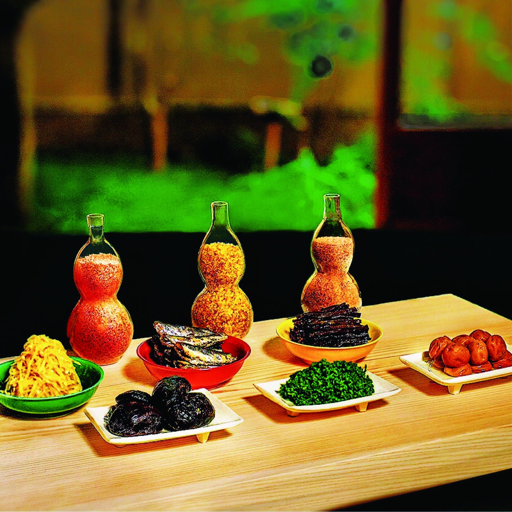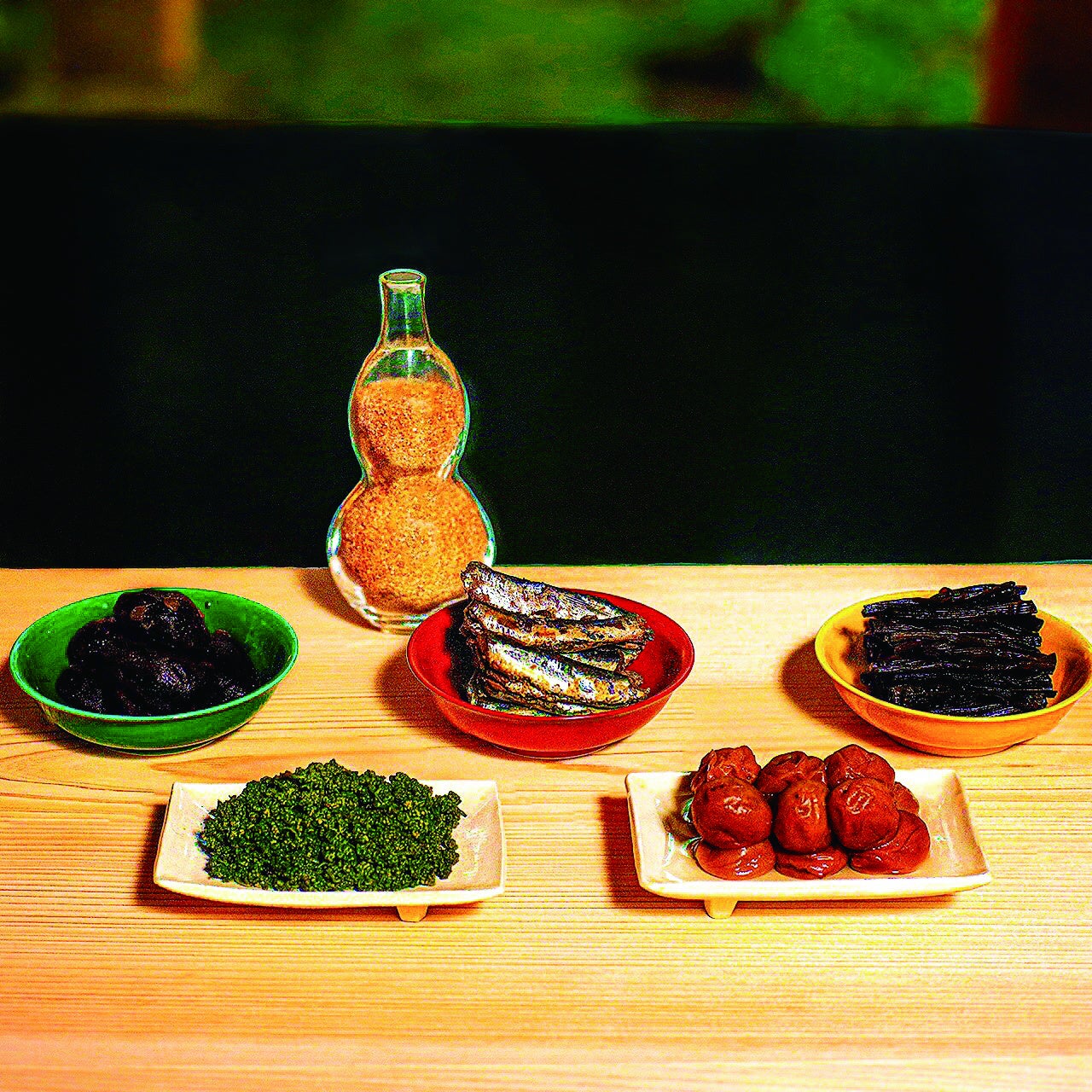 内容:ふりかけ3種(鮭、唐墨、明太子)、ハリハリ大根、鰯、山吹、椎茸 、花・実山椒、小梅