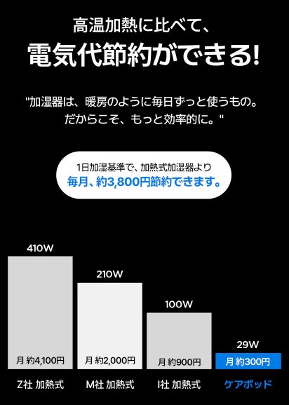 一方、「ケアポッド」は低温で加湿を行う革新的な設計により、消費電力はわずか29W。その結果、加熱式加湿器と比べて毎月約3,800円の節約が可能です。(※1日10時間使用した場合の試算)