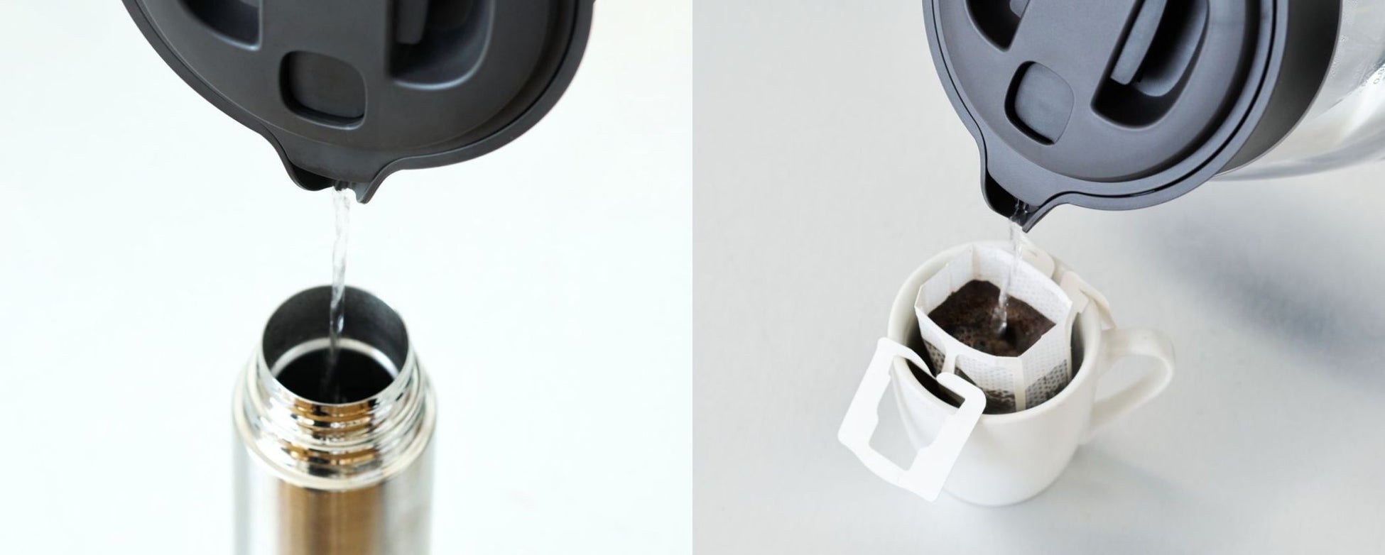 お湯が真下に注げるピンポイント給湯形状です。注ぎ口がやや下向きになっているため、お湯が狙った場所に真下へ落ちやすく、コーヒーカップや口の狭いティーポットにもこぼさず注ぎやすくなっています。