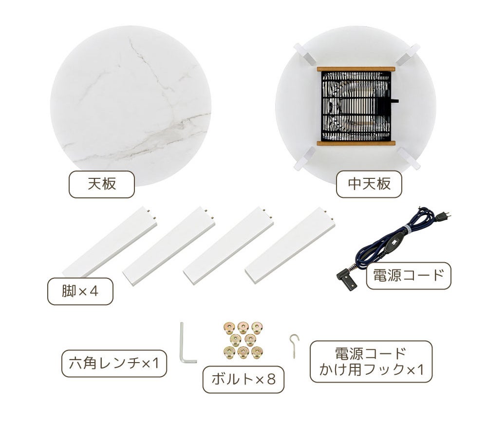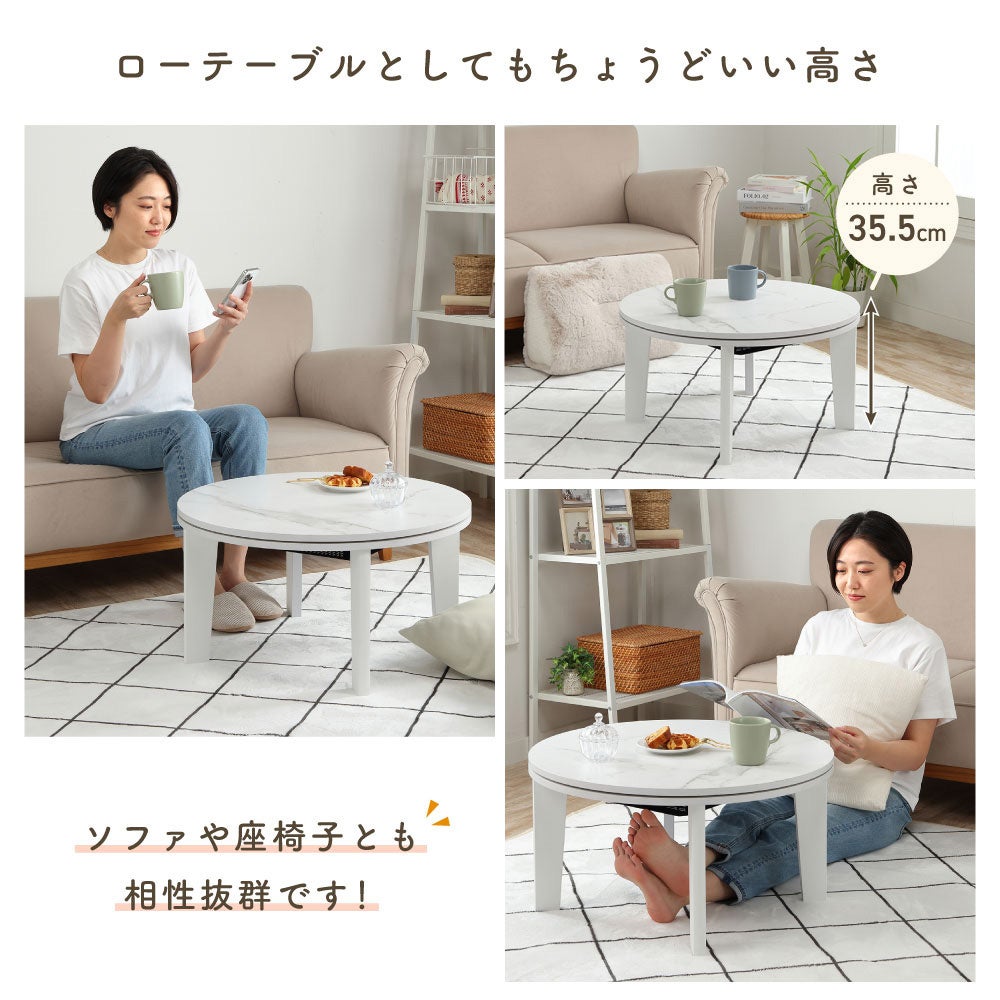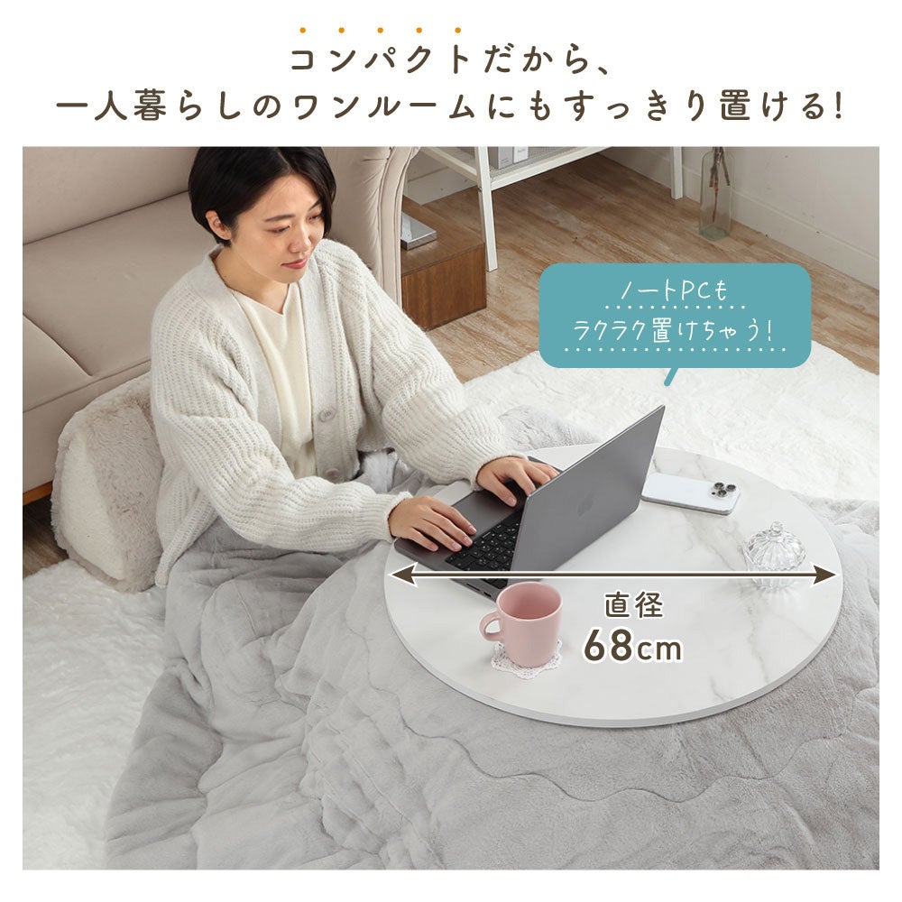 冬の定番アイテムとして快適な暖かさを提供する円形こたつをご紹介します。石英管ヒーターでスピーディーに温まり節約も可能、おしゃれな大理石調のデザインでどのようなインテリアにもマッチする製品です。