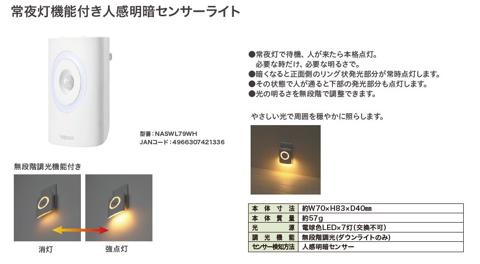 インテリア家電製品および、PCサプライ品の製造販売を手掛ける株式会社ヤザワコーポレーションは、常夜灯機能付き人感明暗センサーライトを発売いたしました。