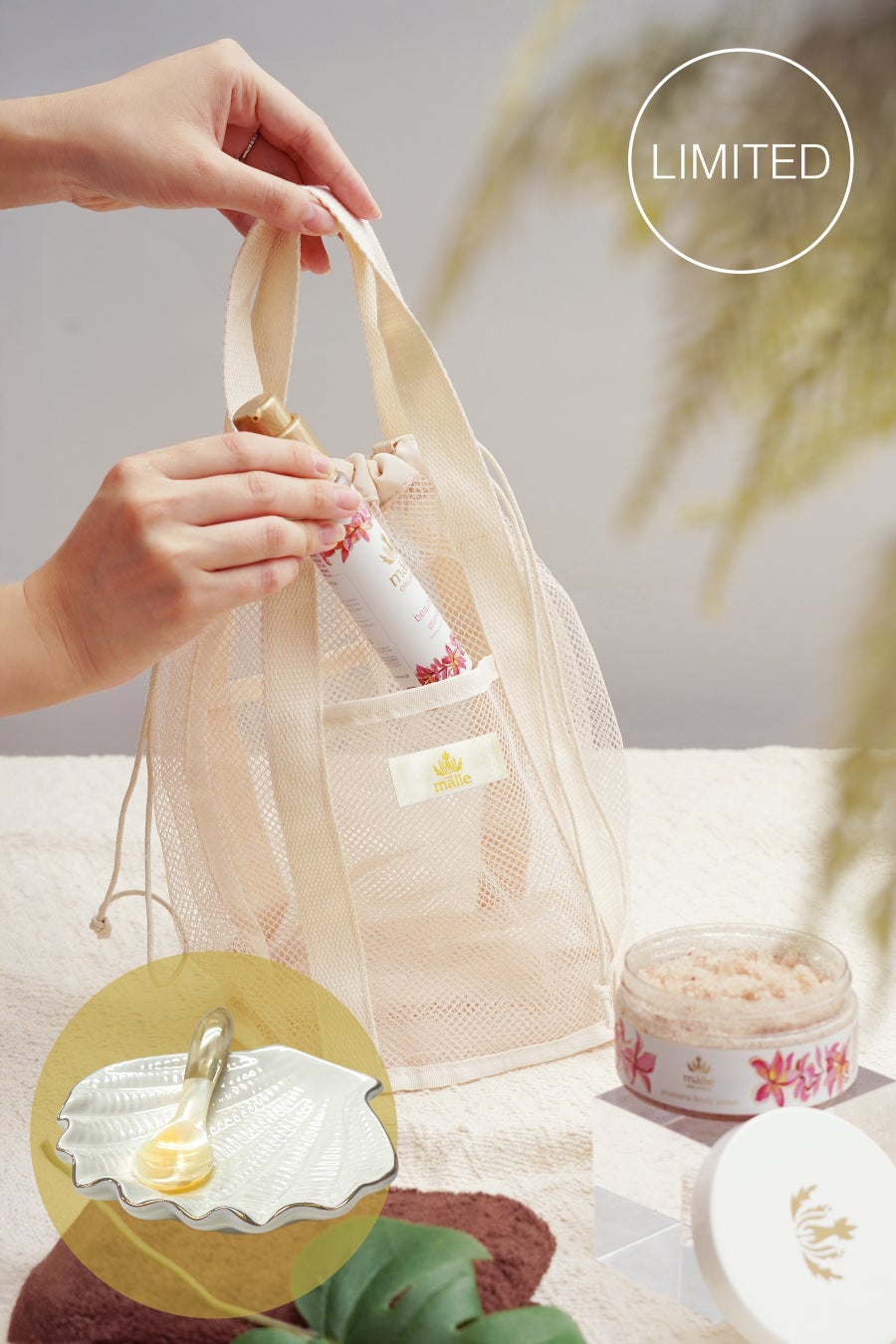 ミネラル豊富なボディポリッシュで肌をなめらかに整え、肌はもちろん、髪にも使えるビューティーオイルがうるおいとツヤを与えます。