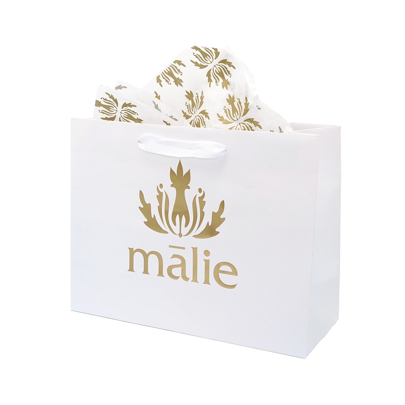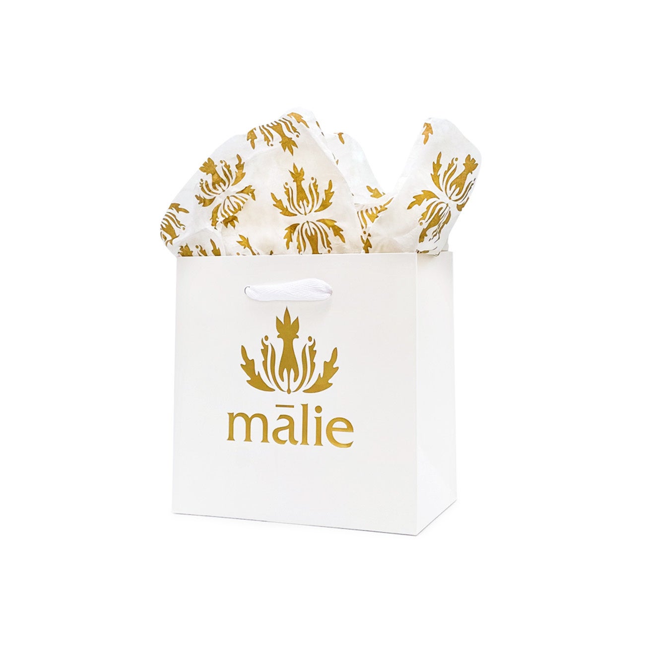白地にゴールドのMalieロゴが映える、上品で華やかなオリジナルショッパーと薄紙のセット。
