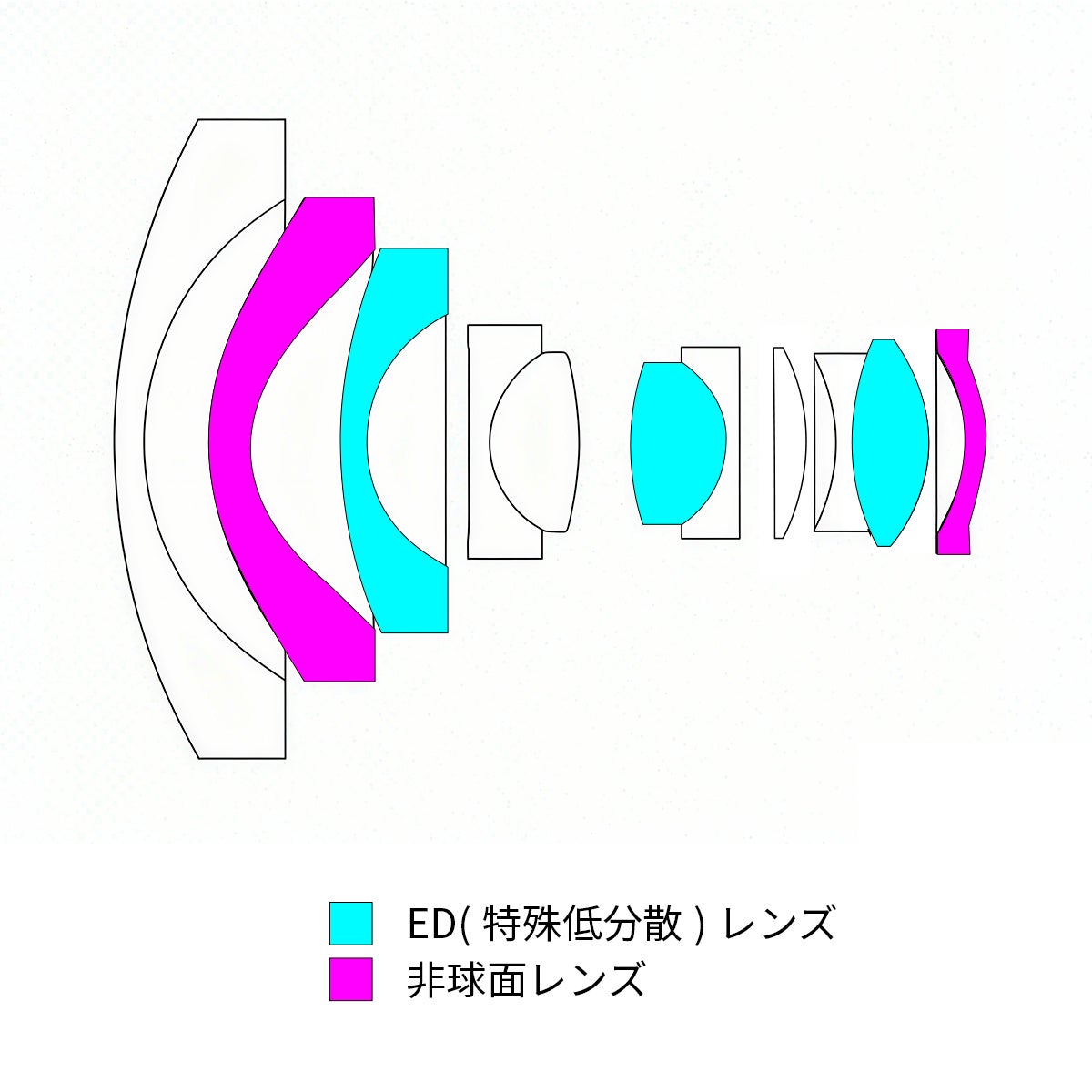 ・レンズ構成:8群11枚(EDレンズ 3枚、非球面レンズ2枚含む)
