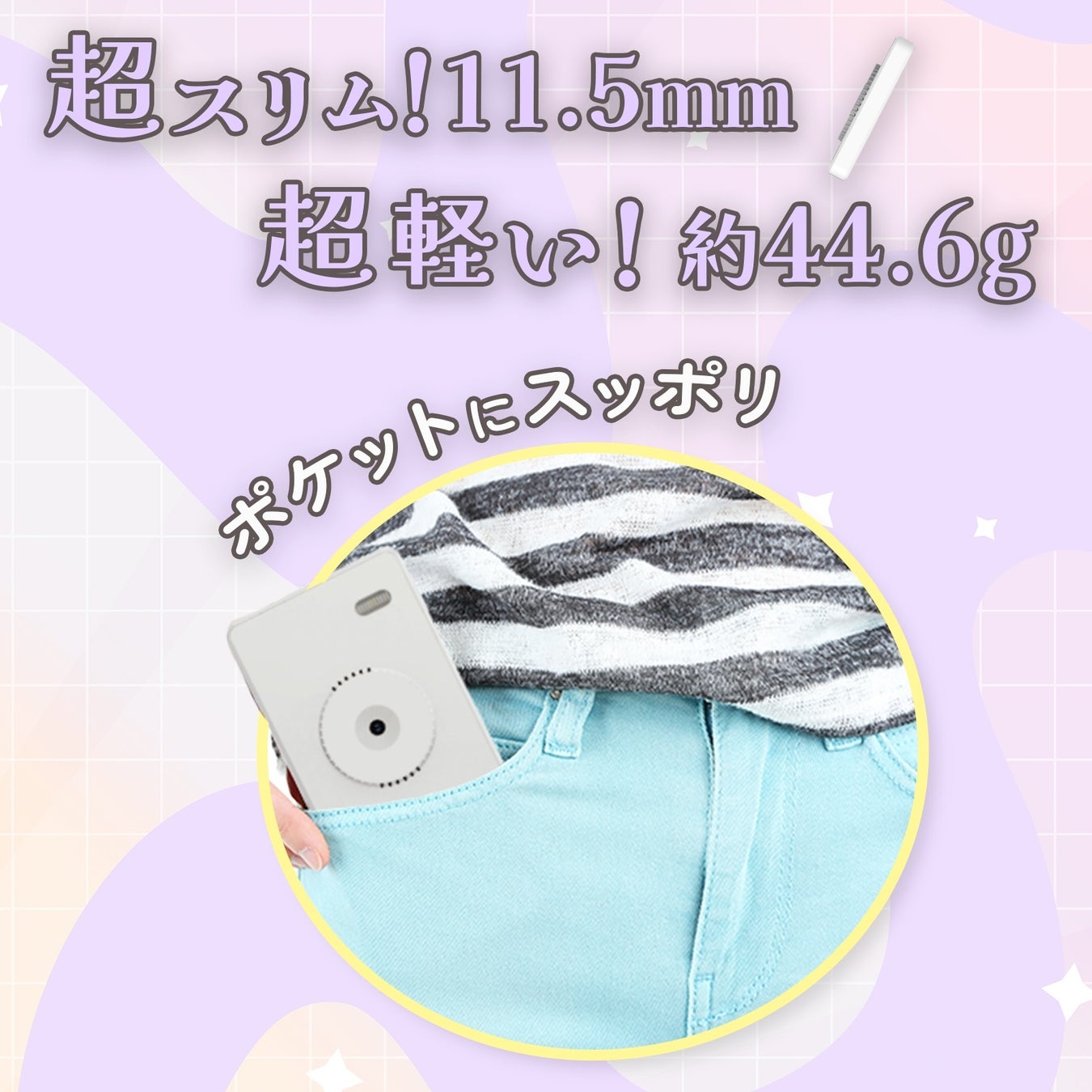 超スリム!11.5mm 超軽い約44.6g ポケットにすっぽり入る! 邪魔にならず、どこでも持ち運びし易いデジタルカメラです。