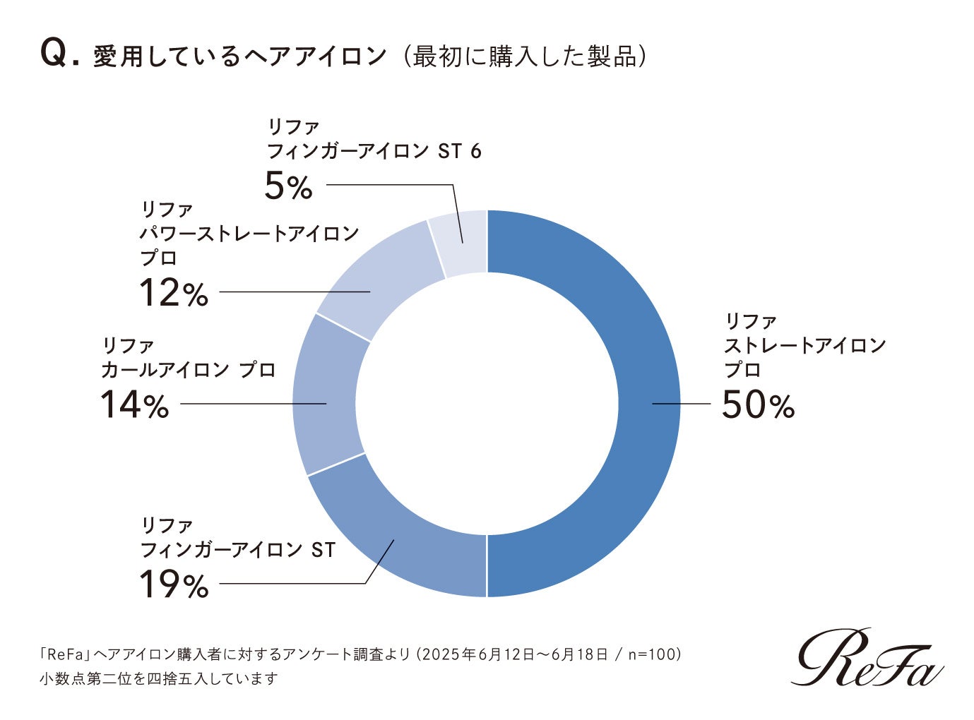 愛用者が最初に購入したReFaのヘアアイロンは、「リファストレートアイロン プロ」が50%と半数を占め、次いで「リファフィンガーアイロン ST」が19%、「リファカールアイロン プロ」が14%の順でした。ストレートアイロンを所持している方が最も多いものの、髪の長さや目指したいヘアスタイル、目的別に複数を使い分けしている方も多く、多様なニーズに対応していることが示されました。