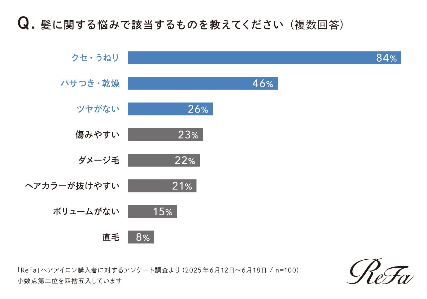 ReFaのヘアアイロン購入者100人を対象にした調査で、髪に関する悩みの上位は「クセ・うねり」が84%、「パサつき・乾燥」が46%、「ツヤがない」が26%でした。そのほかにも「傷みやすい」「ダメージ毛」「ヘアカラーが抜けやすい」など、各20%超の方が複数の髪悩みを抱えていることがわかりました。