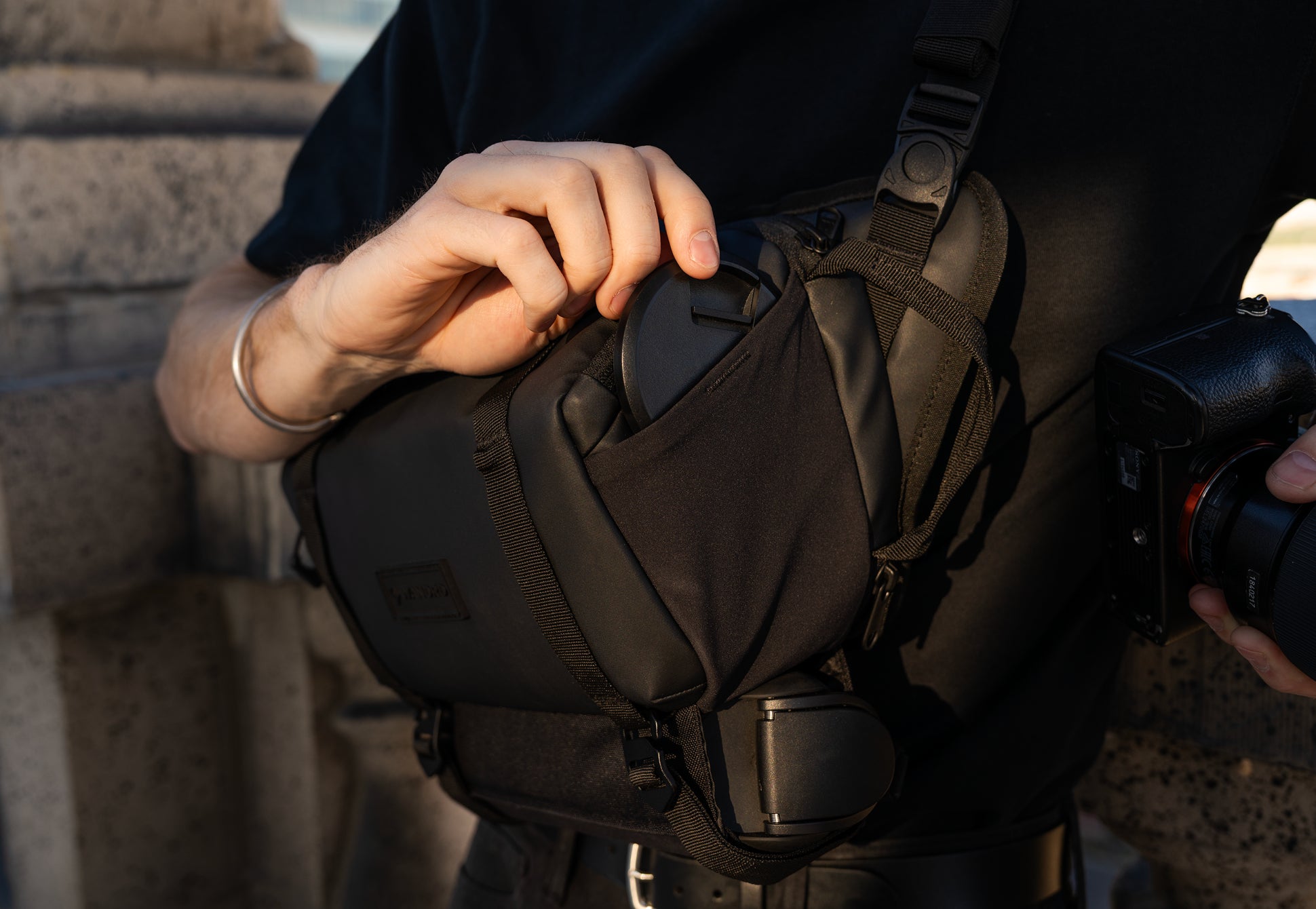 旧モデル同様に耐候性の高い素材を使用し、新たにメインコンパートメントにアクセスしやすいダブルジッパーを採用。内部には取り外しできるディバイダーやAirTag用ポケット、SDカード用ポケット、キーフックなどを備え、小物類を整理して収納でき、外側には新しく2つの伸縮性のあるポケットが追加されました。