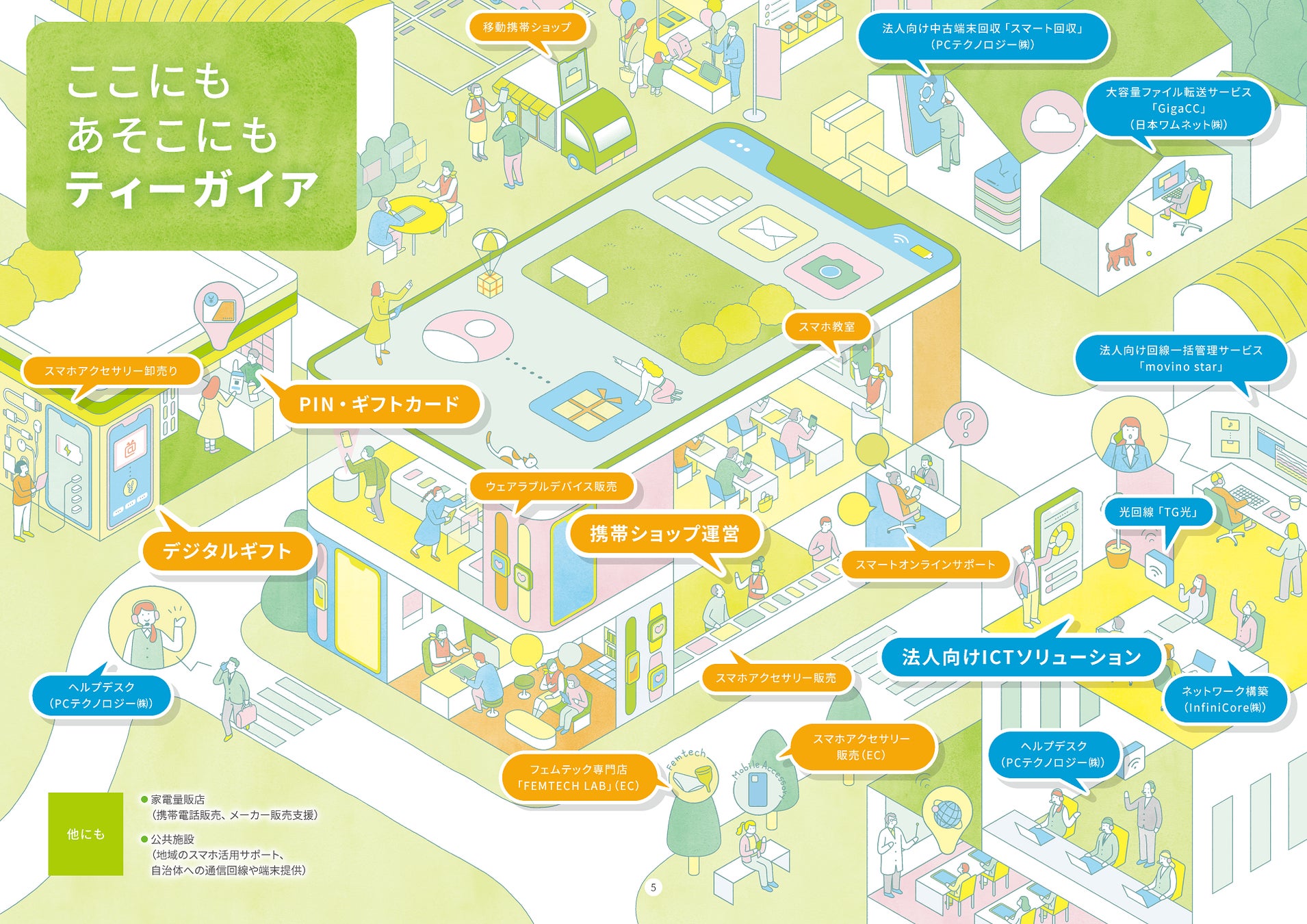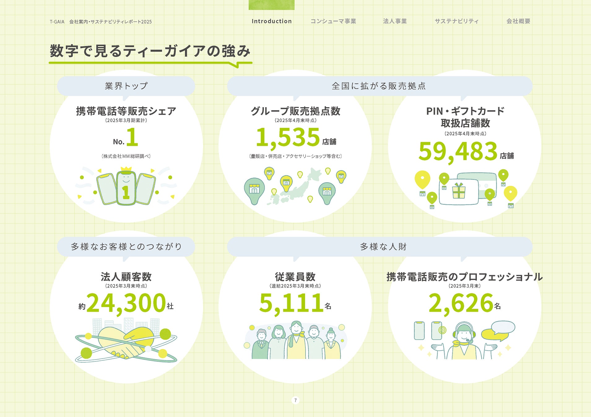 当社の事業が日常のさまざまな場面でお客さまのそばにあることを、街のイラストで表現した「ここにもあそこにもティーガイア」(P.5)や、業界シェア、販売拠点、お客さまとのつながりといった当社の強みを数値で示した「数字で見るティーガイアの強み」(P.7)など、当社の事業領域や価値を具体的に把握できるコンテンツも掲載。また、本レポートの表紙および本文中のイラストは、イラストレーターのたかなかなさんにご制作いただき、親しみやすく、視覚的にも理解しやすい構成となっています。