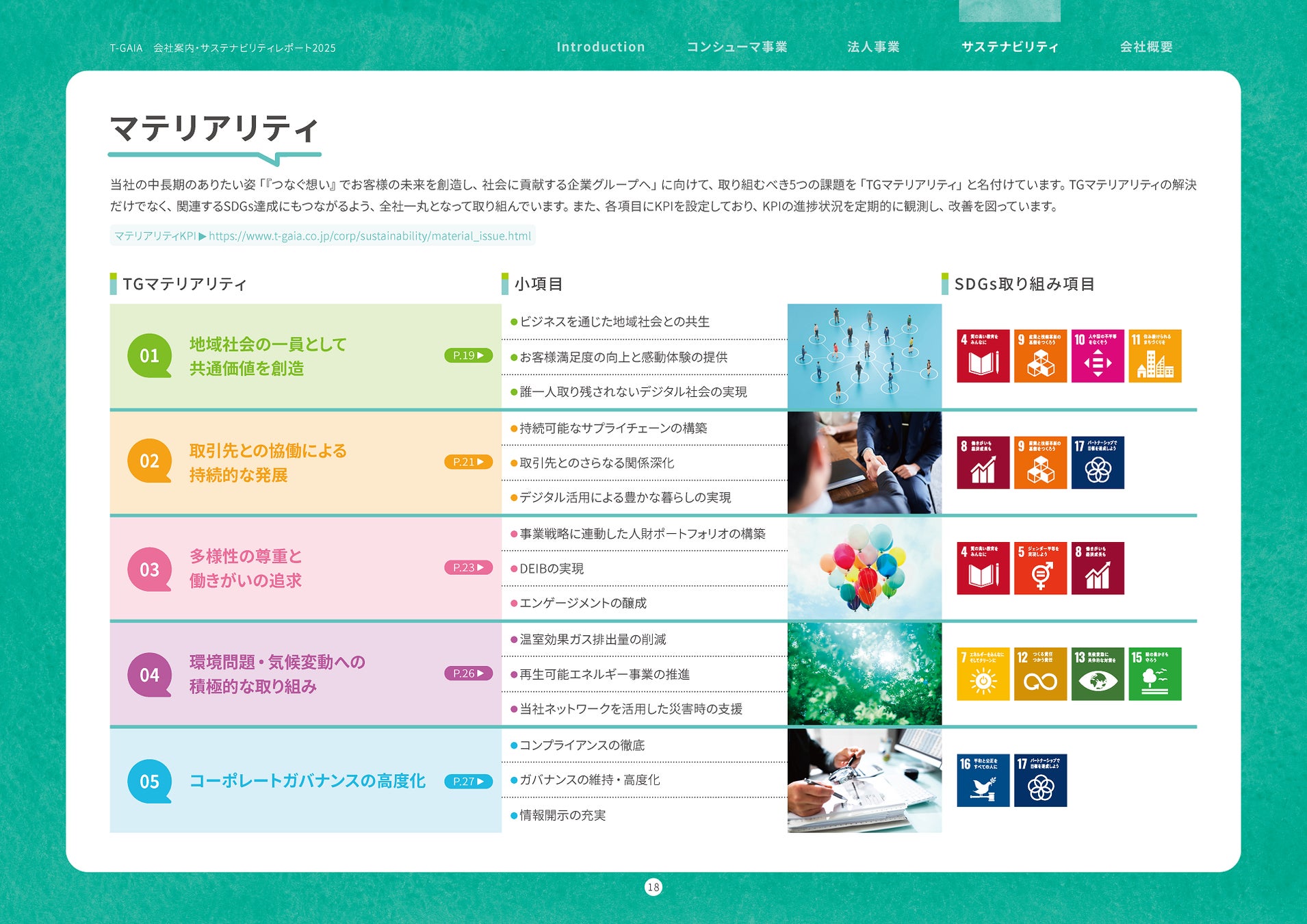 ティーガイアが定める5つのマテリアリティ(重要課題)に沿って、サステナビリティに関する取り組みを紹介しています。