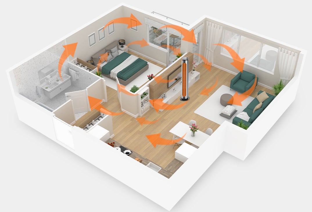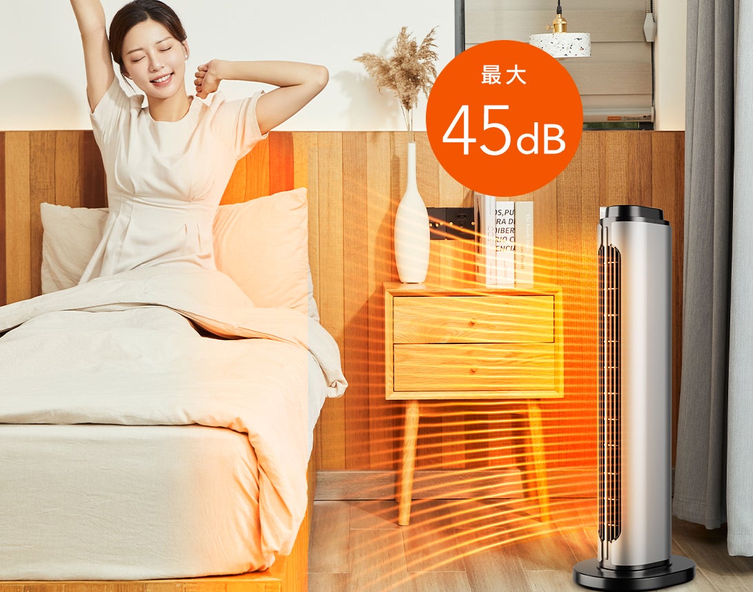 左右100°の自動首振りが、お部屋の隅々まで満遍なく温風を行き渡らせます。ご家族が集まる広いリビングでも、お一人でくつろぐ書斎でも、温度ムラを感じることはありません。足元の冷えが気になる方にも、しっかりと、やさしく温めます。