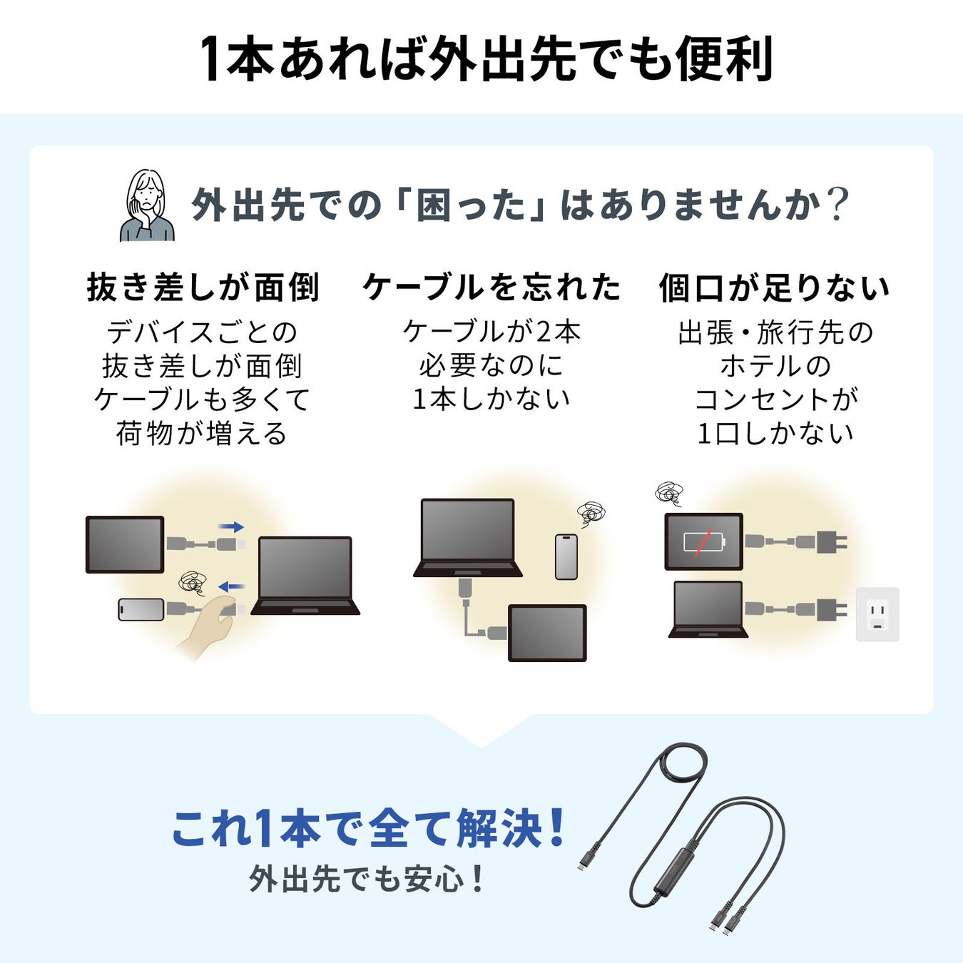 出張や旅行の際に、各機器のケーブルを用意する必要がないため、荷物を減らせます。