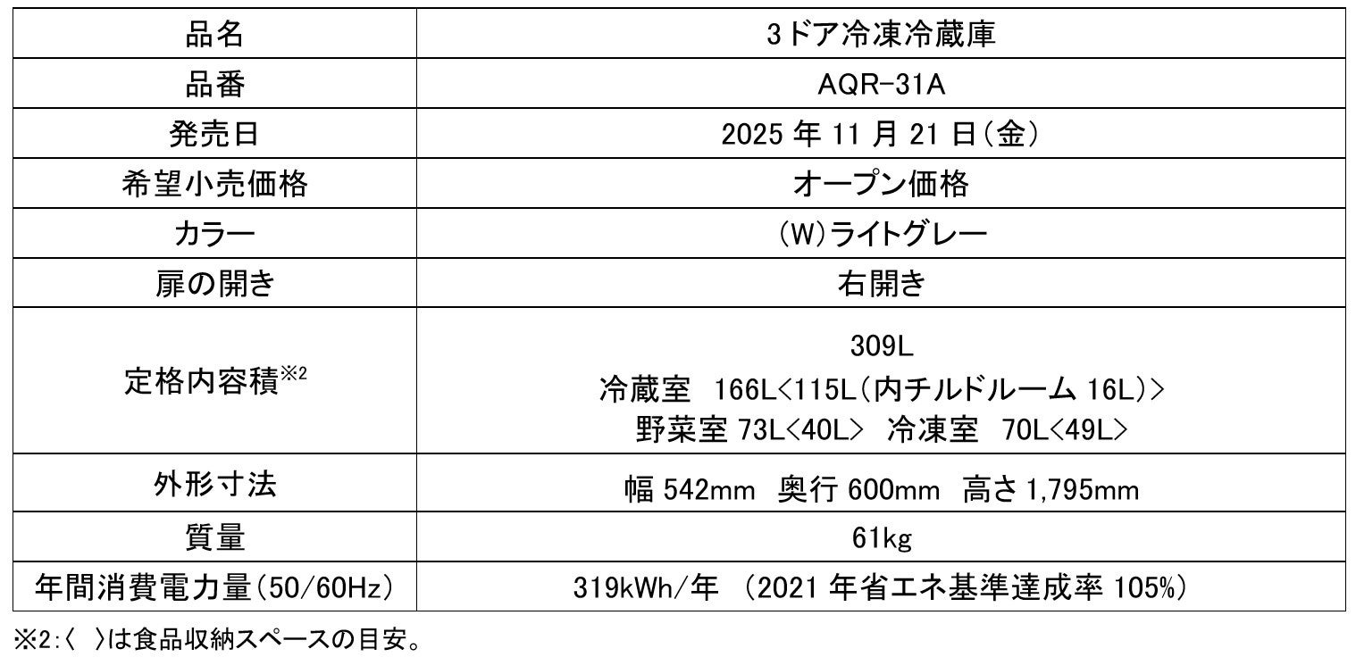 アクア株式会社(本社:東京都中央区、代表取締役社長 兼 CEO:杜 鏡国)は、設置性と使いやすさを追求した3ドア冷凍冷蔵庫「AQR-31A」を、2025年11月21日(金)に新発売いたします。