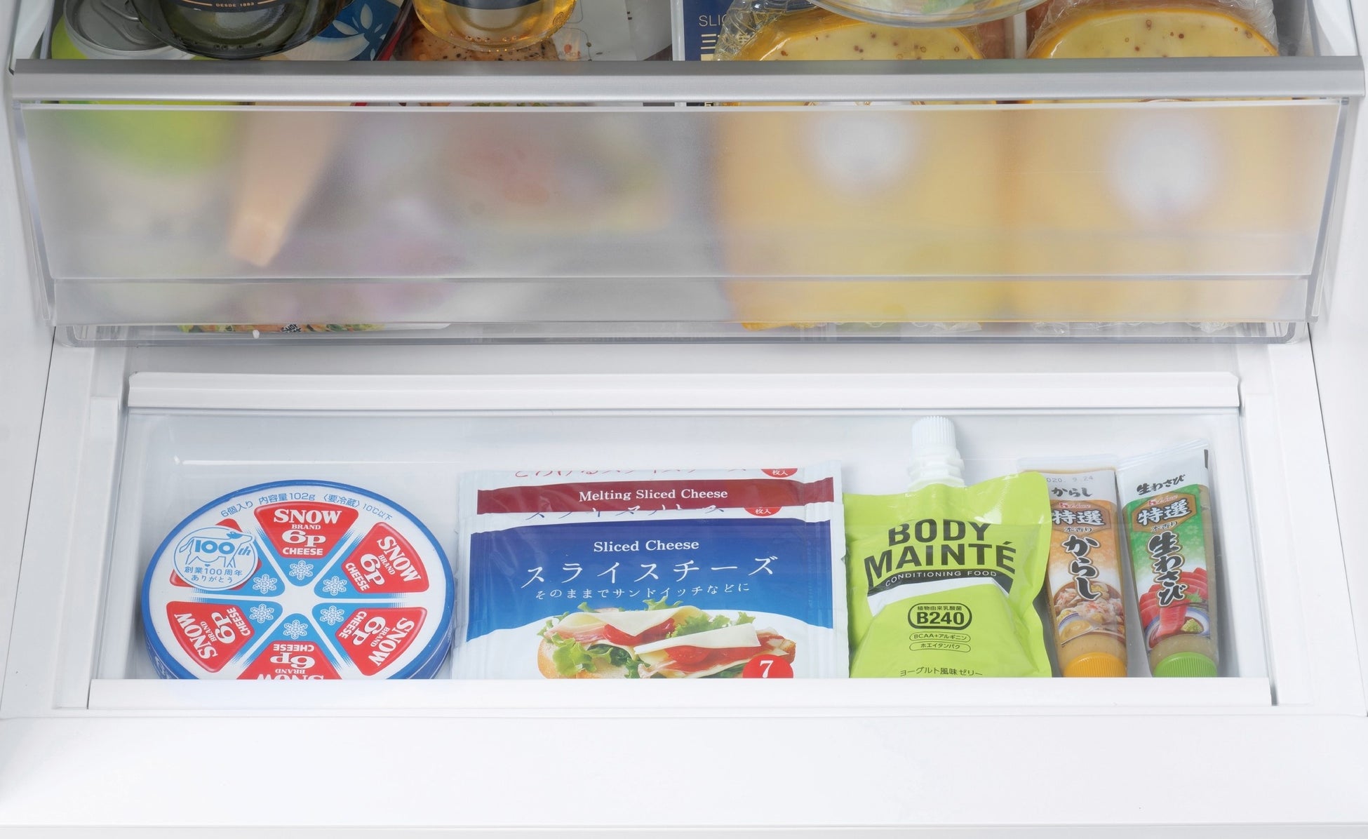 チルドルーム前の空間を有効活用した「小物入れ」で冷蔵室の使い勝手を向上させました。薬味チューブや個装された食品など、散らばりがちな小物や調味料もすっきり整理できます。