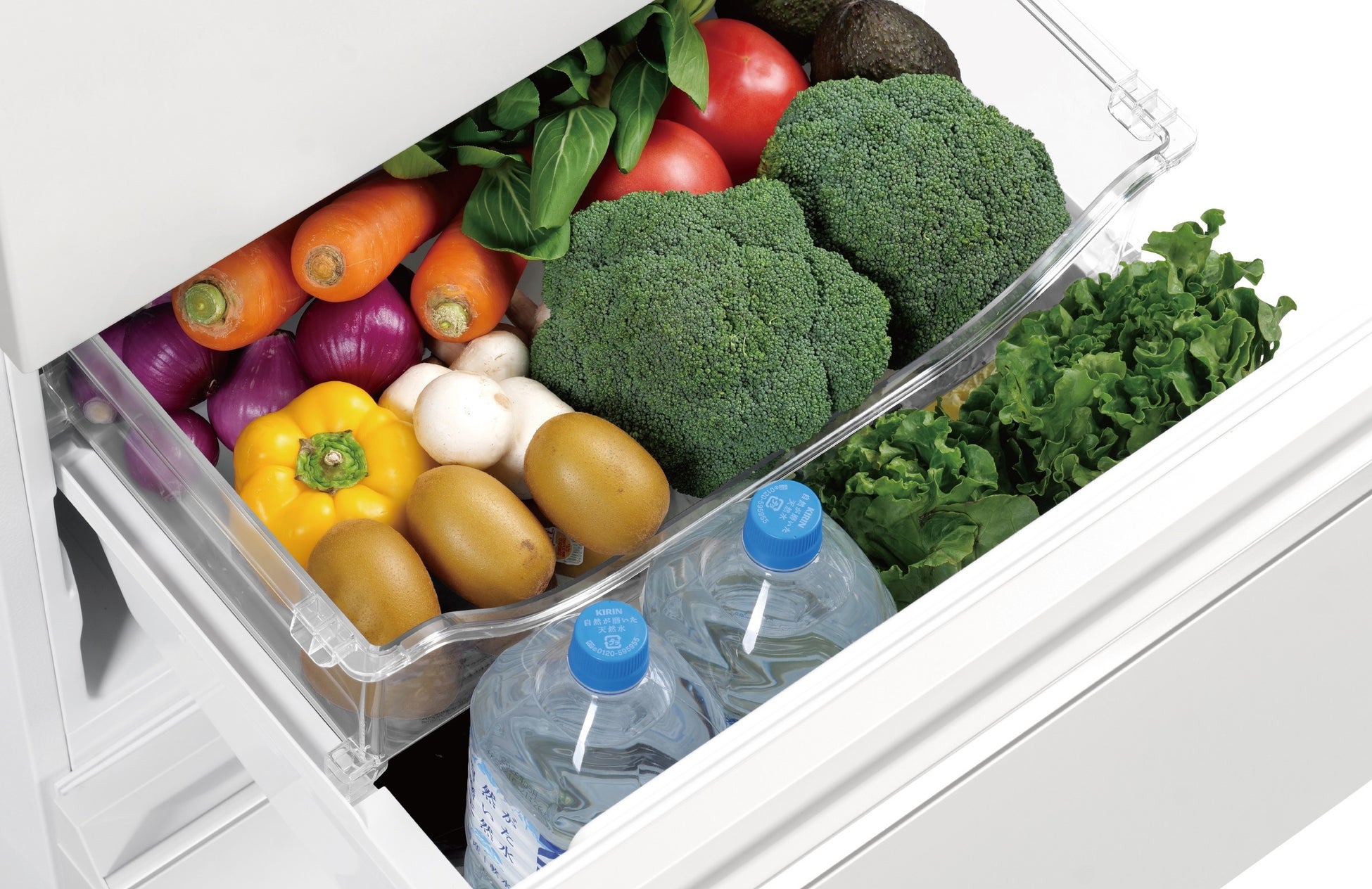 どんなキッチンにもなじみやすい、シンプルで洗練されたデザインを採用。コンパクトながら、冷蔵室166L・野菜室73L・冷凍室70Lの大容量で、2Lペットボトルや大きな野菜も収納可能です。冷蔵室には上質な質感のあるドアポケット付き。奥行き60cm、幅54.2cmのスリム設計でキッチンカウンターからも飛び出さず、限られたスペースにも設置しやすい仕様です。