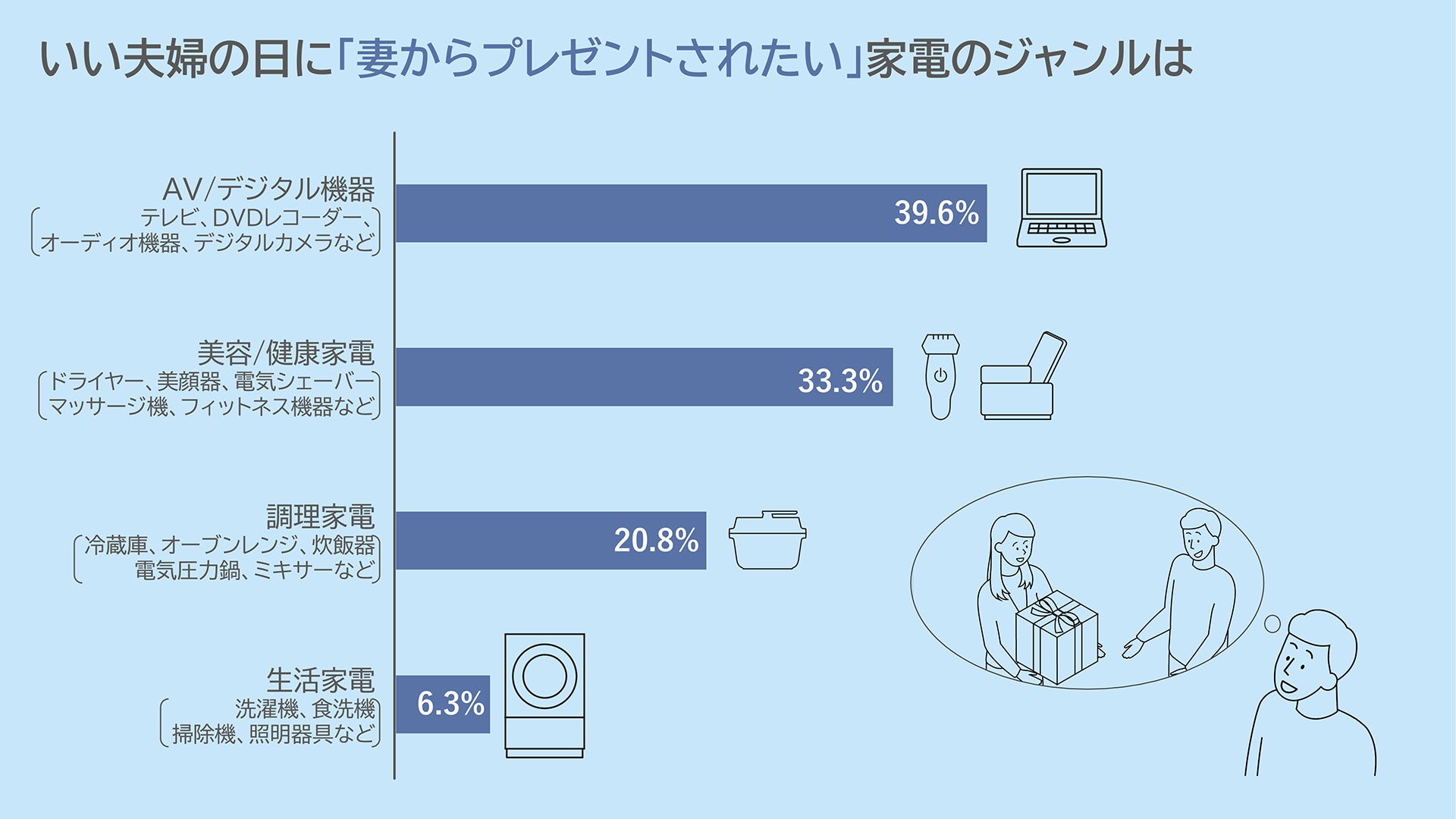 家電のジャンル別では、下記のような結果となりました。「妻からプレゼントされたい家電ランキング」としてAV・デジタル機器が39.6%と最も高く、次に美容/健康家電が33.3%となりました。